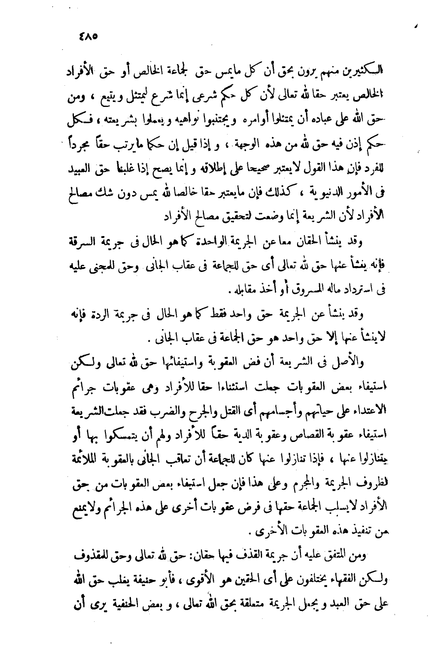 الكثيرين منهم يرون بحق أن كل ما يمس حق الجماعة الخالص أو حق الأفراد الخالص يعتبر حقًا لله تعالى لأن كل حكم شرعى إنما شرع ليمتثل ويتبع، ومن حق الله على عباده