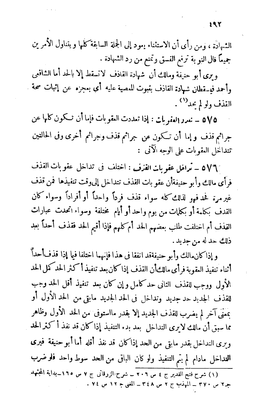 575 - تعدد العقوبات: إذا تعددت العقوبات، فإما أن تكون كلها عن جرائم قذف، وإما أن تكون عن جرائم قذف وجرائم أخرى، وفى الحالتين تتداخل العقوبات على الوجه الآتى: