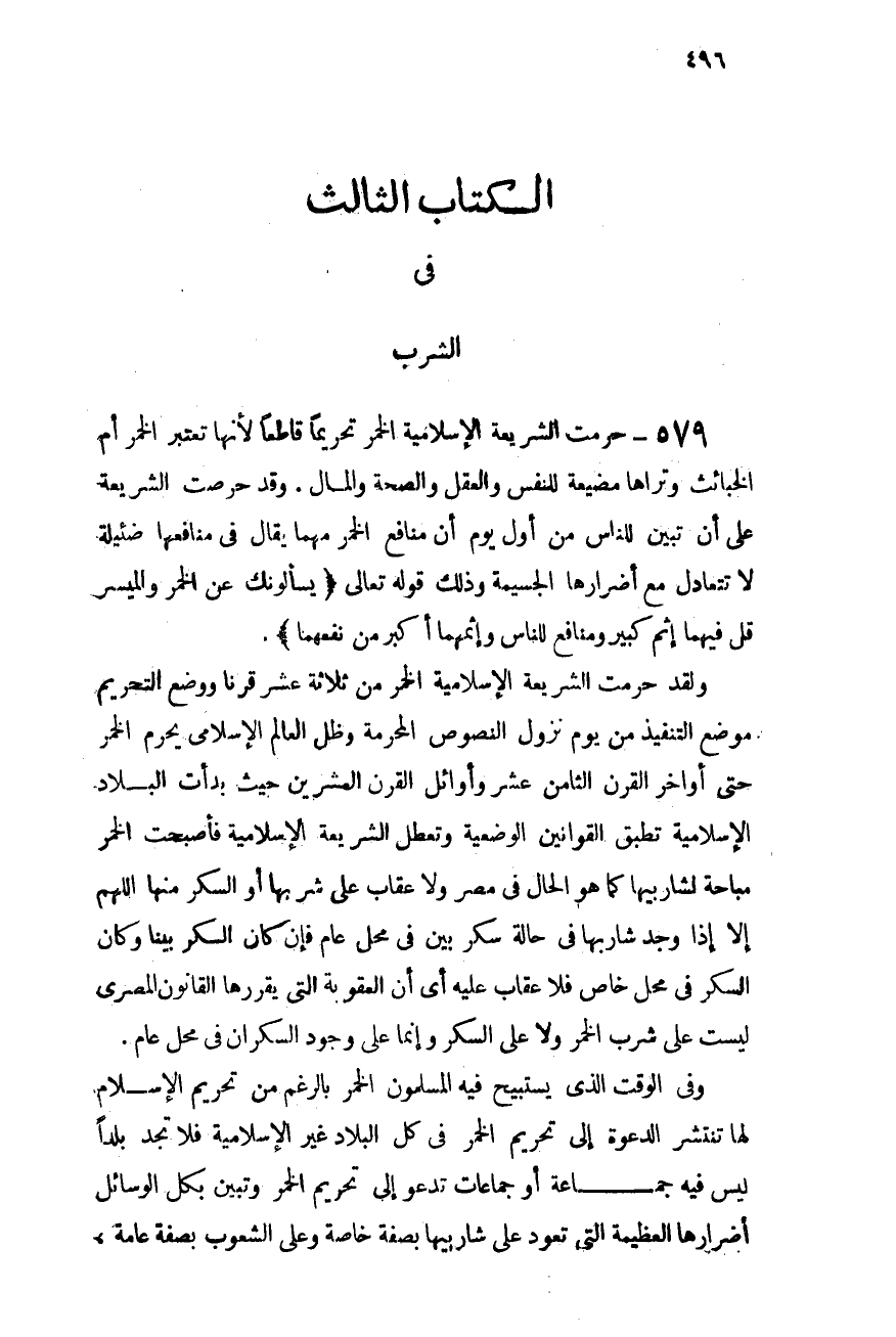 ولقد حرمت الشريعة الإسلامية الخمر من ثلاثة عشر قرنًا، ووضع التحريم موضع التنفيذ من يوم نزول النصوص المحرمة، وظل العالم الإسلامى يحرم الخمر حتى أواخر القرن الثامن عشر وأوائل القرن العشرين حيث بدأت البلاد الإسلامية تطبق القوانين الوضعية وتعطل الشريعة الإسلامية، فأصبحت الخمر مباحة لشاربيها كما هو الحال فى مصر ولا عقاب علىشربها أو السكر منها اللهم إلا إذا وجد شاربها فى حالة سكر بِّين فى محل عام، فإن كان السكر بينًا وكان السكر فى محل خاص فلا عقاب عليه؛ أى أن العقوبة التى يقررها القانون المصرى ليست على شرب الخمر ولا على السكر وإنما على وجود السكران فى محل عام.