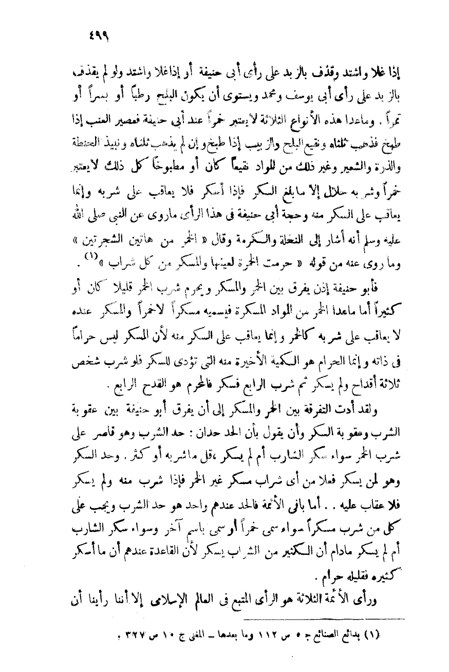 فأبو حنيفة إذن يفرق بين الخمر والمسكر ويحرم شرب الخمر قليلًا كان أو كثيرًا أما ما عدا الخمر من المواد المسكرة فيسميه مسكرًا لا خمرًا، والمسكر عنده لا يعاقب على شربه كالخمر وإنما يعاقب على السُّكر منه؛ لأن المسكر ليس حرامًا فى ذاته وإنما الحرام هو الكمية الأخيرة منه التى تؤدى للسكر، فلو شرب شخص ثلاثة أقداح ولم يسكر ثم شرب الرابع فسكر فالمحرم هو القدح الرابع.