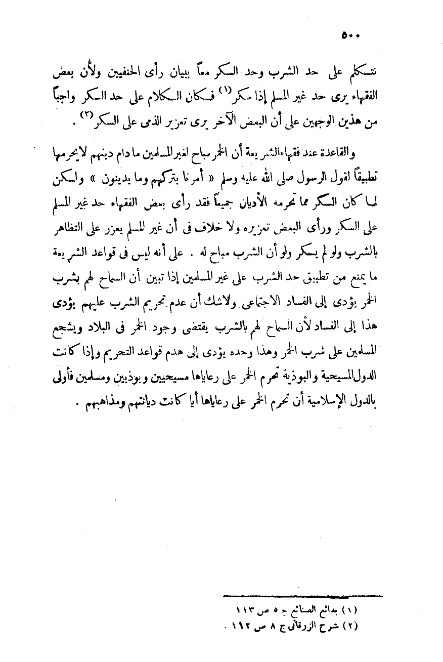 والقاعدة عند فقهاء الشريعة أن الخمر مباح لغير المسلمين ما دام دينهم لا يحرمها تطبيقًا لقول الرسول - صلى الله عليه وسلم -: "أمرنا بتركهم وما يدينون" ولكن لما كان السكر مما تحرمه الأديان جميعًا فقد رأى بعض الفقهاء حد غير المسلم على السكر ورأى البعض تعزيره، ولا خلاف فى أن غير المسلم يعزر على التظاهر بالشرب ولو لم يسكر ولو أن الشرب مباح له. على أنه ليس فى قواعد الشريعة ما يمنع من تطبيق حد الشرب على غير المسلمين إذا تبين أن السماح لهم بشرب الخمر يؤدى إلى الفساد الاجتماعى، ولا شك أن عدم تحريم الشرب عليهم يؤدى هذا إلى الفساد؛ لأن السماح لهم بالشرب يقتضى وجود الخمر فى البلاد ويشجع المسلمين على شرب الخمر، وهذا وحده يؤدى إلى هدم قواعد التحريم. وإذا كانت الدول المسيحية والبوذية تحرم الخمر على رعاياهم مسيحيين وبوذيين ومسلمين فأولى بالدول الإسلامية أن تحرم الخمر على رعاياها أيًا كانت ديانتهم ومذاهبهم.