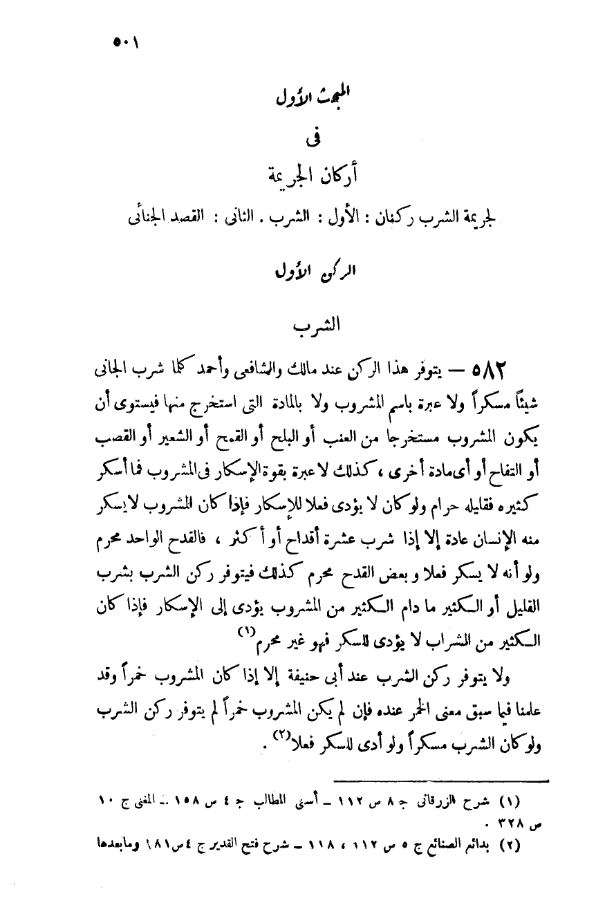 582 - يتوفر هذا الركن عند مالك والشافعى وأحمد كلما شرب الجانى شيئًا مسكرًا، ولا عبرة باسم المشروب ولا بالمادة التى استخرج منها، فيستوى أن يكون المشروب مستخرجًا من العنب أو البلح أو القمح أو الشعير أو القصب أو التفاح أو أى مادة أخرى، كذلك لا عبرة بقوة الإسكار فى المشروب فما أسكر كثيره فقليلة حرام ولو كان لا يؤدى فعلا للإسكار، فإذا كان المشروب لا يسكر منه الإنسان عادة إلا إذا شرب عشرة أقداح أو أكثر، فالقدح الواحد محرم ولو أنه لا يسكر فعلًا وبعض القدح محرم كذلك فيتوفر ركن الشرب بشرب القليل أو الكثير مادام الكثير من المشروب يؤدى إلى الإسكار، فإذا كان الكثير من الشراب لا يؤدى للسكر فهو غير محرم (¬1) .