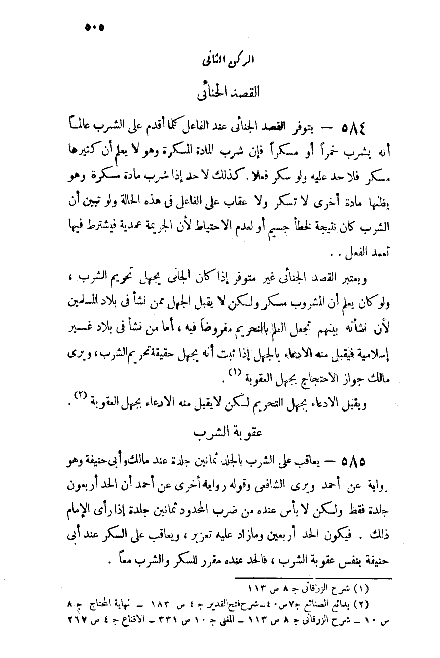 585 - يعاقب على الشرب بالجلد ثمانين جلدة عند مالك وأبى حنيفة، وهو رواية عن أحمد. ويرى الشافعى وقوله رواية أخرى عن أحمد أن الحد أربعون جلدة فقط، ولكن لا بأس عنده من ضرب المحدود ثمانين جلدة إذا رأى الإمام ذلك، فيكون الحد أربعين وما زاد عليه تعزير. ويعاقب على السكر عند أبى حنيفة بنفس عقوبة الشرب فالحد عنده مقرر للسكر والشرب معًا.