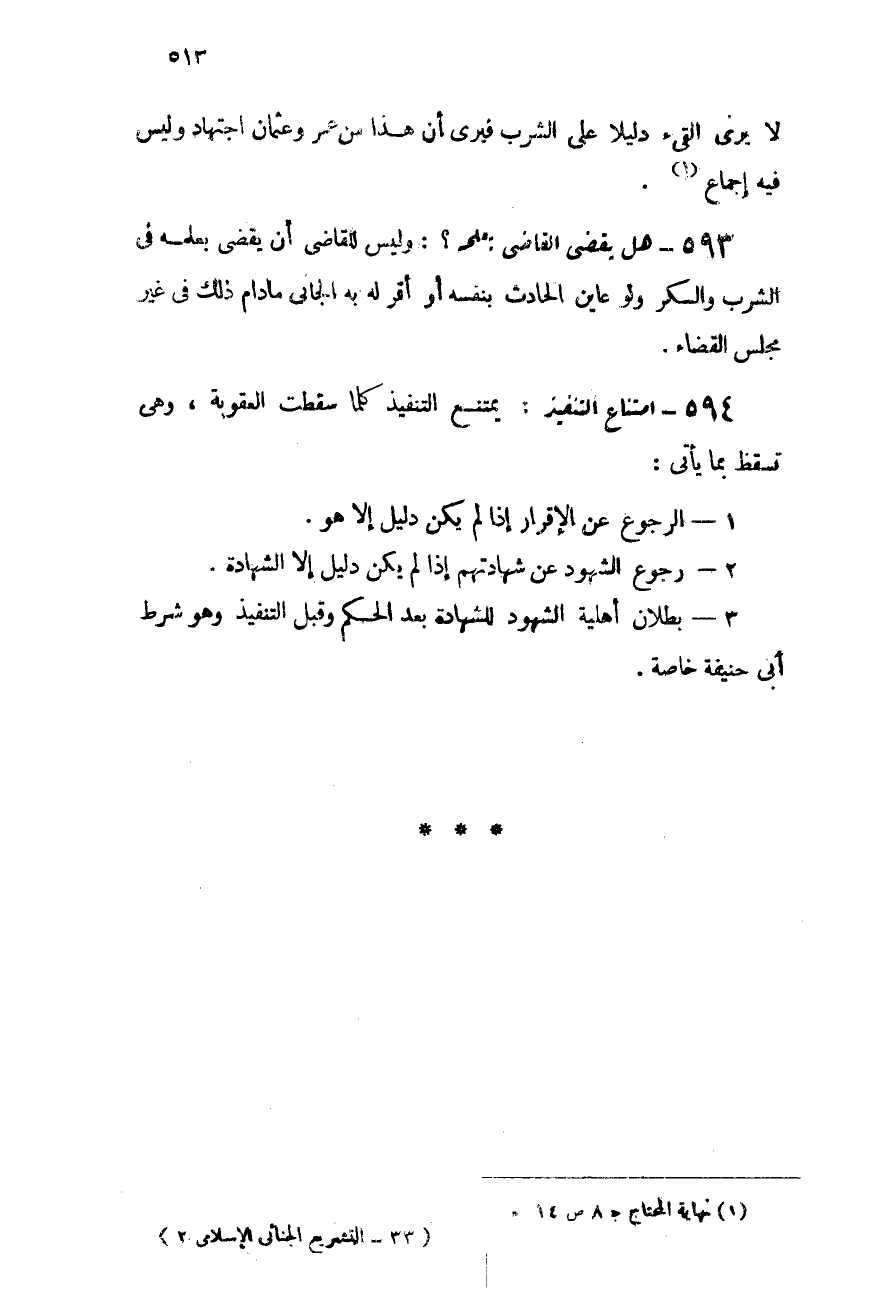 593- هل يقضى القاضى بعلمه؟: وليس للقاضى أن يقضى بعلمه فى الشرب والسكر ولو عاين الحادث بنفسه أو أقر له به الجانى ما دام ذلك فى غير مجلس القضاء.