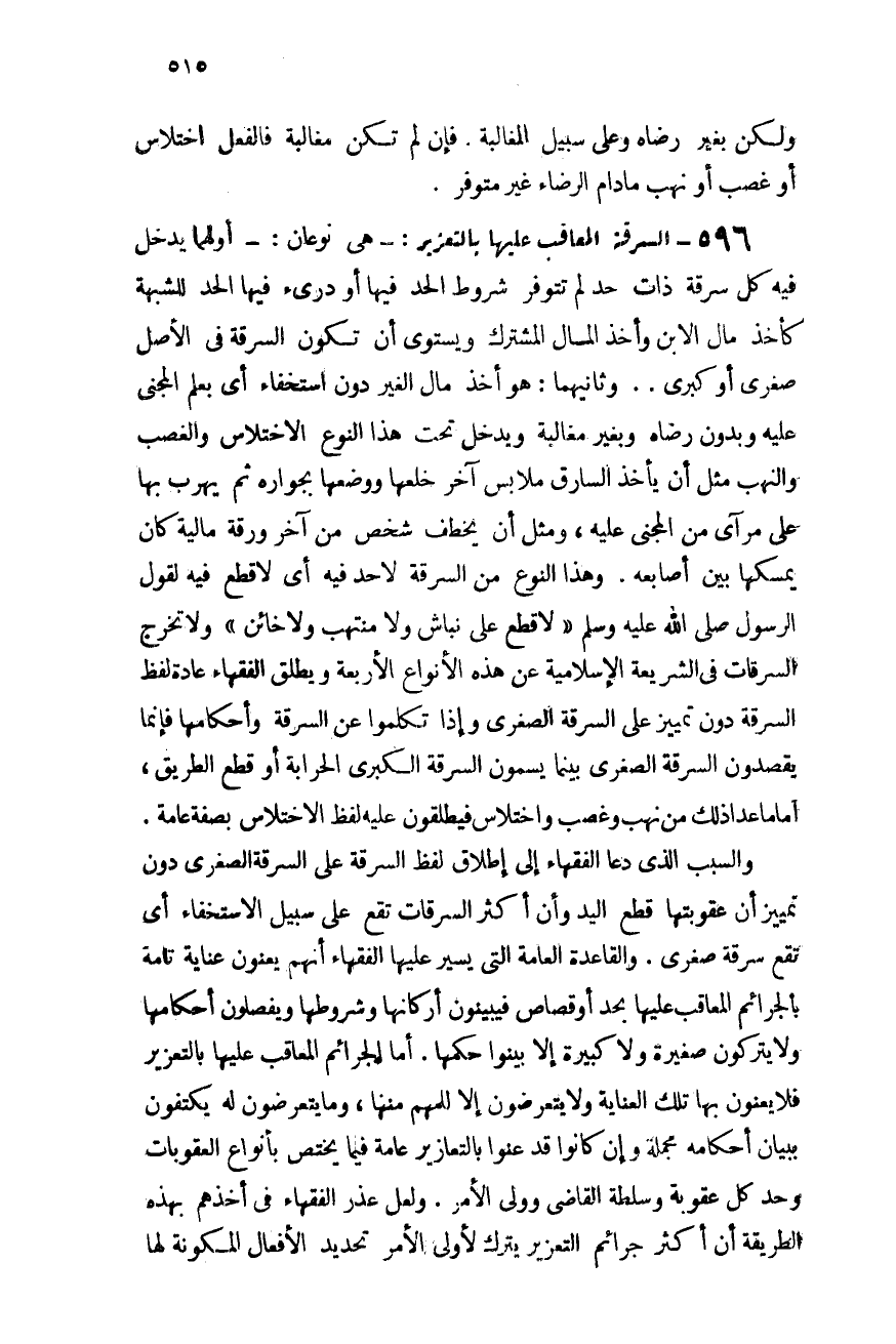 596- السرقة المعاقب عليها بالتعزير: هى نوعان: أولهما: يدخل فيه كل سرقة ذات حد لم تتوفر شروط الحد فيها أو درأ فيها الحد للشبهة كأخذ مال الابن وأخذ المال المشترك, ويستوى أن تكون السرقة فى الأصل صغرى أو كبرى. وثانيهما: هو أخذ مال الغير دون استخفاء؛ أى بعلم المجنى عليه وبدون رضاه وبغير مغالبة, ويدخل تحت هذا النوع الاختلاس والغصب والنهب, مثل أن يأخذ السارق ملابس آخر خلعها ووضعها بجواره ثم يهرب بها على مرأى من المجنى عليه, ومثل أن يخطف شخص من آخر ورقة مالية كان يمسكها بين أصابعه. وهذا النوع من السرقة لا حد فيه أى لا قطع فيه لقول الرسول - صلى الله عليه وسلم -: "لا قطع على نباش ولا منتهب ولا خائن", ولا تخرج السرقات فى الشريعة الإسلامية عن هذه الأنواع الأربعة, ويطلق الفقهاء عادة لفظ السرقة دون تمييز على السرقة الصغرى, وإذا تكلموا على السرقة وأحكامها فإنما يقصدون السرقة الصغرى بينما يسمون السرقة الكبرى الحرابة أو قطع الطريق, أما ما عدا ذلك من نهب وغصب واختلاس فيطلقون عليه لفظ الاختلاس بصفة عامة.