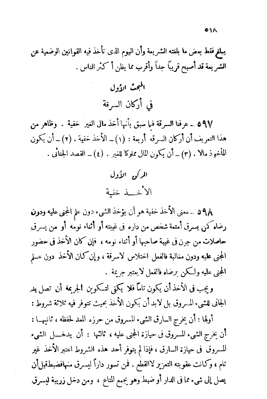 597- عرفنا السرقة فيما سبق بأنها أخذ مال الغير خفية. وظاهر من هذا التعريف أن أركان السرقة أربعة: