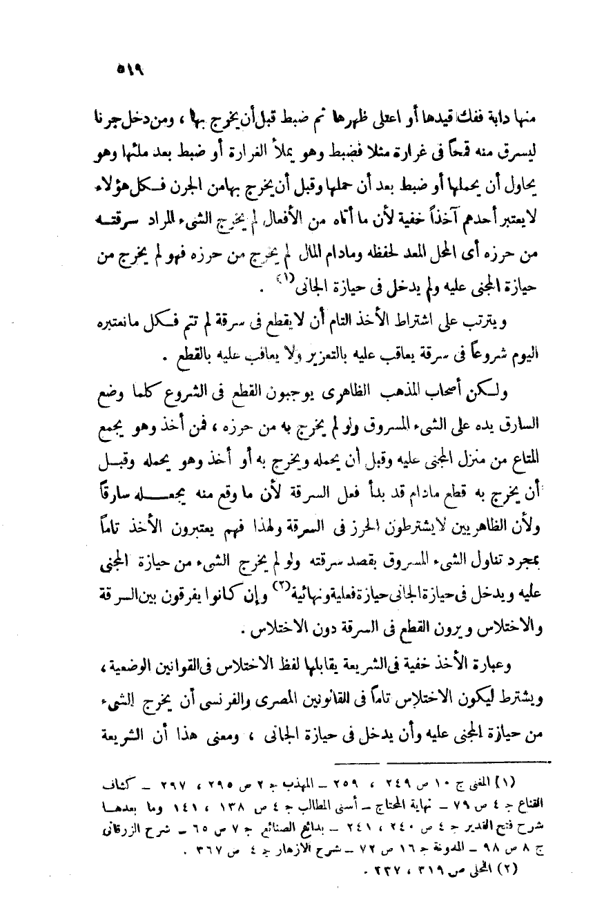 منها دابة ففك قيدها أو اعتلى ظهرها ثم ضبط قبل أن يخرج بها, ومن دخل جرناً ليسرق منه قمحاً فى غرارة مثلاً فضبط وهو يملأ الغرارة أو ضبط بعد ملئها وهو يحاول أن يحملها أو ضبط بعد أن حملها وقبل أن يخرج بها من الجرن- فكل هؤلاء لا يعتبر أحدهما آخذاً خفية لأن ما أتاه من الأفعال لم يخرج الشىء المراد سرقته من حرزه أى المحل المعد لحفظه وما دام المال لم يخرج من حرزه فهو لم يخرج من حيازة المجنى عليه ولم يدخل فى حيازة الجاني (¬1) .