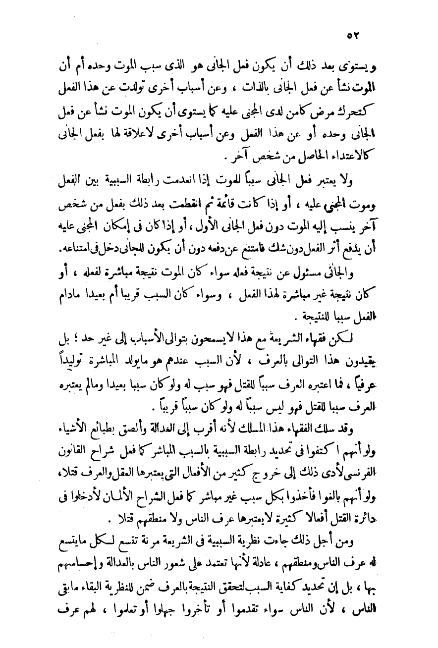 وقد سلك الفقهاء هذا المسلك لأنه أقرب إلى العدالة وألصق بطبائع الأشياء ولو أنهم اكتفوا فى تحديد رابطة السببية بالسبب المباشر - كما فعل شراح القانون الفرنسى- لأدى ذلك إلى خروج كثير من الأفعال التى يعتبرها هذا العقل والعرف قتلاً ولو أنهم بالغوا فأخذوا بكل سبب غير مباشر - كما فعل الشراح الألمان - لأدخلوا فى دائرة القتل أفعالاً كثيرة لا يعتبرها عرف الناس ولا منطقهم قتلاً.
