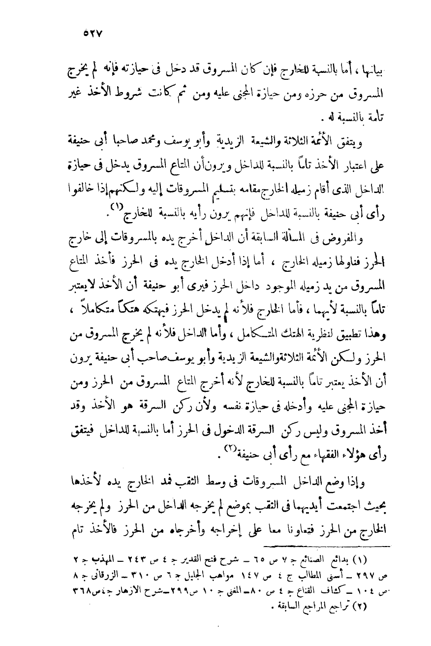 والمفروض فى المسألة السابقة أن الداخل أخرج يده بالمسروقات إلى خارج الحرز فناولها زميله الخارج، أما إذا أدخل الخارج يده فى الحرز فأخذ المتاع المسروق من يد زميله الموجود داخل الحرز، فيرى أبو حنيفة أن الأخذ لا يعتبر تاماً بالنسبة لأيهما، فأما الخارج فلأنه لم يدخل الحرز فيهتكه هتكاً متكاملاً، وهذا تطبيق لنظرية الهتك المتكامل، وأما الداخل فلأنه لم يخرج المسروق من الحرز ولكن الأئمة الثلاثة والشيعة الزيدية وأبا يوسف صاحب أبى حنيفة يرون أن الأخذ يعتبر تاماً بالنسبة للخارج لأنه أخرج المتاع المسروق من الحرز ومن حيازة المجنى عليه وأدخله فى حيازة نفسه، ولأن ركن السرقة هو الأخذ وقد أخذ المسروق وليس ركن السرقة الدخول فى الحرز، أما بالنسبة للداخل فيتفق رأى هؤلاء الفقهاء مع رأى أبى حنيفة (¬2) .