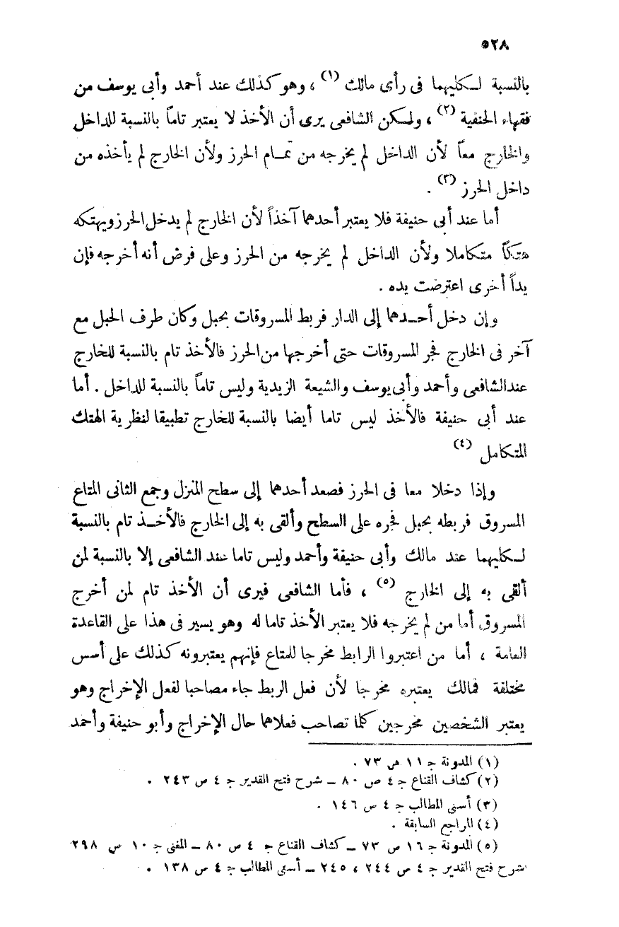بالنسبة لكليهما فى رأى مالك (¬1) ، وهو كذلك عند أحمد وأبى يوسف من فقهاء الحنفية (¬2) ، ولكن الشافعى يرى أن الأخذ لا يعتبر تاماً بالنسبة للداخل والخارج معاً؛ لأن الداخل لم يخرجه من تمام الحرز ولأن الخارج لم يأخذه من داخل الحرز (¬3) .