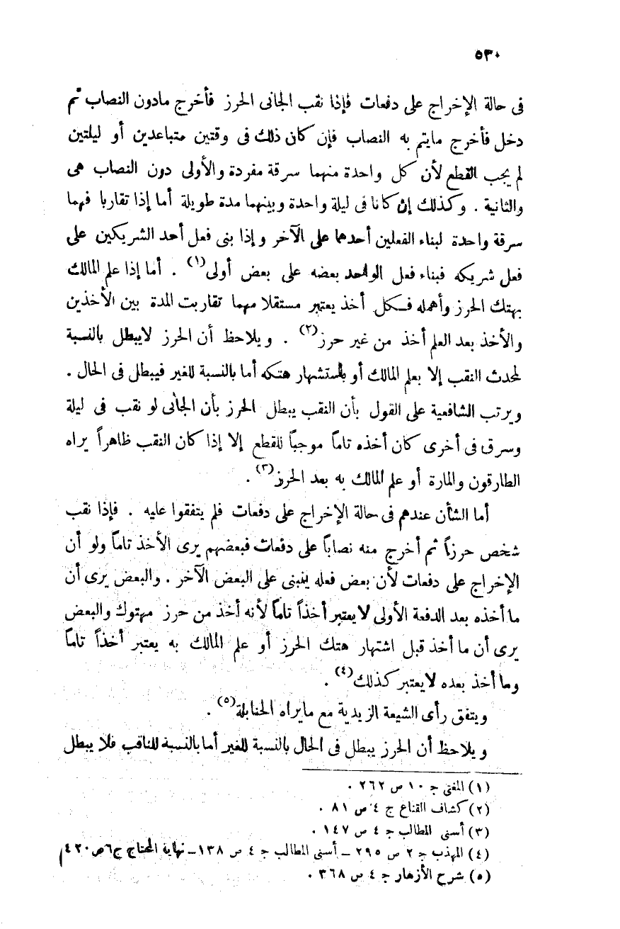 أما الشأن عندهم فى حالة الإخراج على دفعات فلم يتفقوا عليه. فإذا نقب شخص حرزاً ثم أخرج منه نصاباً على دفعات, فبعضهم يرى الأخذ تاماً ولو أن الإخراج على دفعات لأن بعض فعله ينبنى على البعض الآخر. والبعض يرى أن ما أخذه بعد الدفعة الأولى لا يعتبر أخذاً تاماً لأنه أخذ من حرز مهتوك. والبعض يرى أن ما أخذ قبل اشتهار هتك الحرز أو علم المالك بع يعتبر أخذاً تاماً, وما أخذ بعده لا يعتبر كذلك (¬4) .