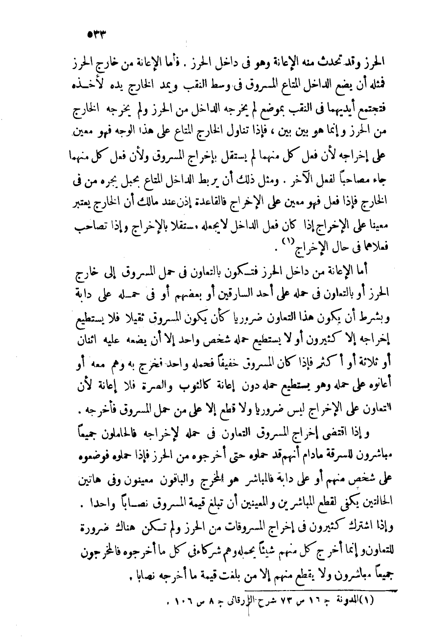 وإذا اقتضى إخراج المسروق التعاون فى حمله لإخراجه فالحاملون جميعاً مباشرون للسرقة ما دام أنهم قد حملوه حتى أخرجوه من الحرز, فإذا حملوه فوضعوه على شخص منهم أو على دابة فالمباشر هو مخرج والباقون معينون, وفى هاتين الحالتين يكفى لقطع المباشرين والمعينين أن تبلغ قيمة المسروق نصاباً واحداًً. وإذا اشترك كثيرون فى إخراج المسروقات من الحرز ولم تكن هناك ضرورة للتعاون وإنما أخرج كل منهم شيئاً يحمله وهم شركاء فى كل ما أخرجوه فالمخرجون جميعاً مباشرون ولا يقطع منهم إلا من بلغت قيمة ما أخرجه نصاباً,