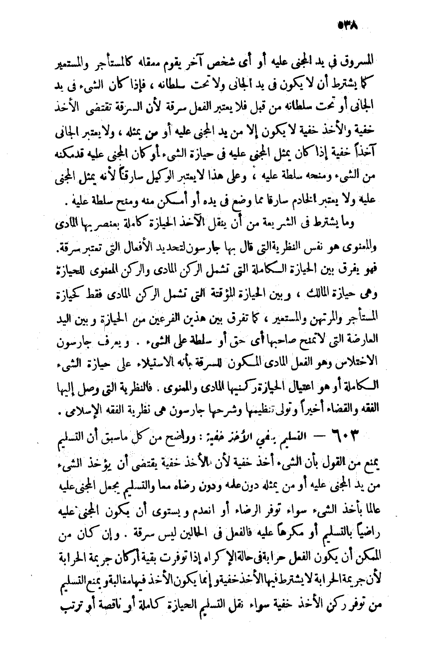 وما يشترط فى الشريعة من أن ينقل الآخذ الحيازة كاملة بعنصريها المادى والمعنوى هو نفس النظرية التى قال بها جارسون لتحديد الأفعال التى تعتبر سرقة. فهو يفرق بين الحيازة الكاملة التى تشمل الركن المادى والركن المعنوى للحيازة وهى حيازة المالك, وبين الحيازة المؤقتة التى تشمل الركن المادى فقط كحيازة المستأجر والمرتهن والمستعير, كما يفرق بين هذين الفرعين من الحيازة وبين اليد المعارضة التى لا تمنح صاحبها أى حق أو سلطة على شىء. ويعرف جارسون الاختلاس وهو الفعل المادى المكون للسرقة بأنه الاستيلاء على حيازة الشىء الكاملة, أو هو اعتيال الحيازة ركنيها المادى والمعنوى. فالنظرية التى وصل إليها الفقه والقضاء أخيراً وتولى تنظيمها وشرحها جارسون هى نظرية الفقه الإسلامى.
