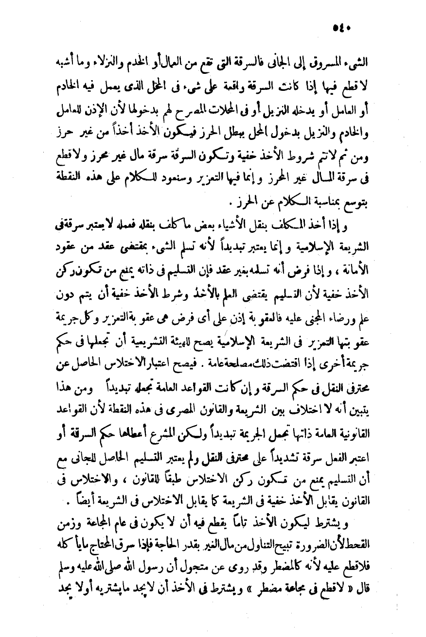 وإذا أخذ المكلف بنقل الأشياء بعض ما كُلِّف بنقله فعمله لا يعتبر سرقة فى الشريعة الإسلامية وإنما يعتبر تبديداً لأنه تسلم الشىء بمقتضى عقد من عقود الأمانة, وإذا فرض أنه تسلمه بغير عقد فإن التسليم فى ذاته يمنع من تكون ركن الأخذ خفية لأن التسليم يقتضى العلم بالأخذ وشرط الأخذ خفية أن يتم دون علم ورضاء المجنى عليه, فالعقوبة إذن على أى فرض هى عقوبة التعزير وكل جريمة عقوبتها التعزير فى الشريعة الإسلامية يصح للهيئة التشريعية أن تجعلها فى حكم جريمة أخرى إذا اقتضت ذلك مصلحة عامة, فيصح اعتبار الاختلاس الحاصل عن محترفى النقل فى حكم السرقة وإن كانت القواعد العامة تجعله تبديداً. ومن هذا يتبين أنه لا اختلاف بين الشريعة والقانون المصرى فى هذه النقطة؛ لأن القواعد القانونية العامة ذاتها تجعل الجريمة تبديداً ولكن المشرع أعطاها حكم السرقة أو اعتبر الفعل سرقة تشديداً على محترفى النقل ولم يعتبر التسليم الحاصل للجانى مع أن التسليم يمنع من تكون ركن الاختلاس طبقاً للقانون, والاختلاس فى القانون يقابل الأخذ خفية فى الشريعة كما يقابل الاختلاس فى الشريعة أيضاً.
