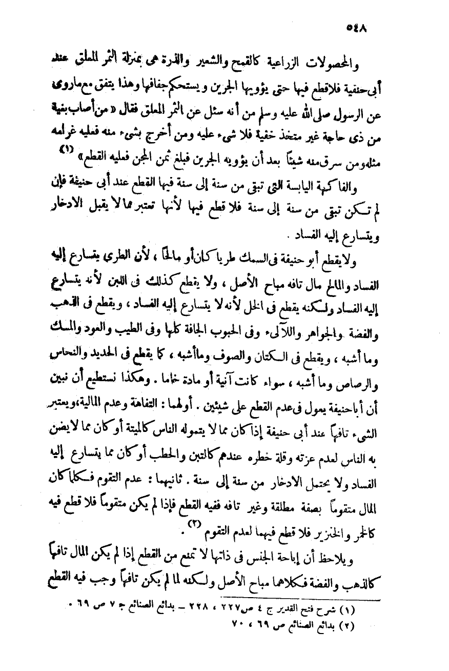 ولا يقطع أبو حنيفة فى السمك طرياً كان أو مالحاً، لأن الطرى يتسارع إليه الفساد والمالح مال تافه مباح الأصل، ولا يقطع كذلك فى اللبن لأنه يتسارع إليه الفساد ولكنه يقطع فى الخل لأنه لا يتسارع إليه الفساد، ويقطع فى الذهب والفضة والجواهر واللآلئ وفى الحبوب الجافة كلها وفى الطيب والعود والمسك وما أشبه، ويقطع فى الكتان والصوف وما أشبه، كما يقطع فى الحديد والنحاس والرصاص وما أشبه، سواء كانت آنية أو مادة خاماً. وهكذا نستطيع أن نتبين أن أبا حنيفة يعول فى عدم القطع على شيئين:
