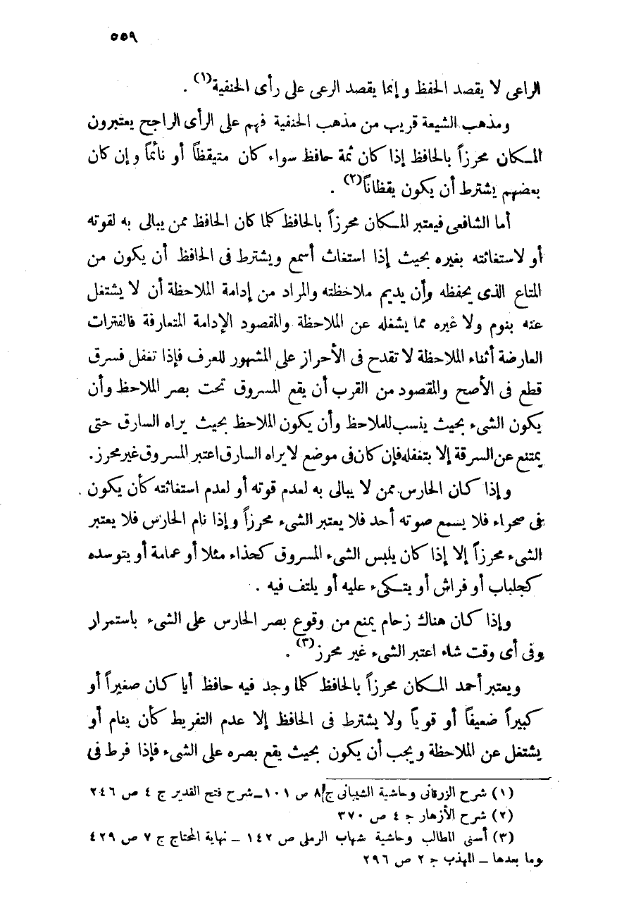ومذهب الشيعة قريب من مذهب الحنفية, فهم على الرأى الراجح يعتبرون المكان محرزاً بالحافظ إذا كان ثمة حافظ سواء كان متيقظاً أو نائماً وإن كان بعضهم يشترط أن يكون يقظان (¬2) .