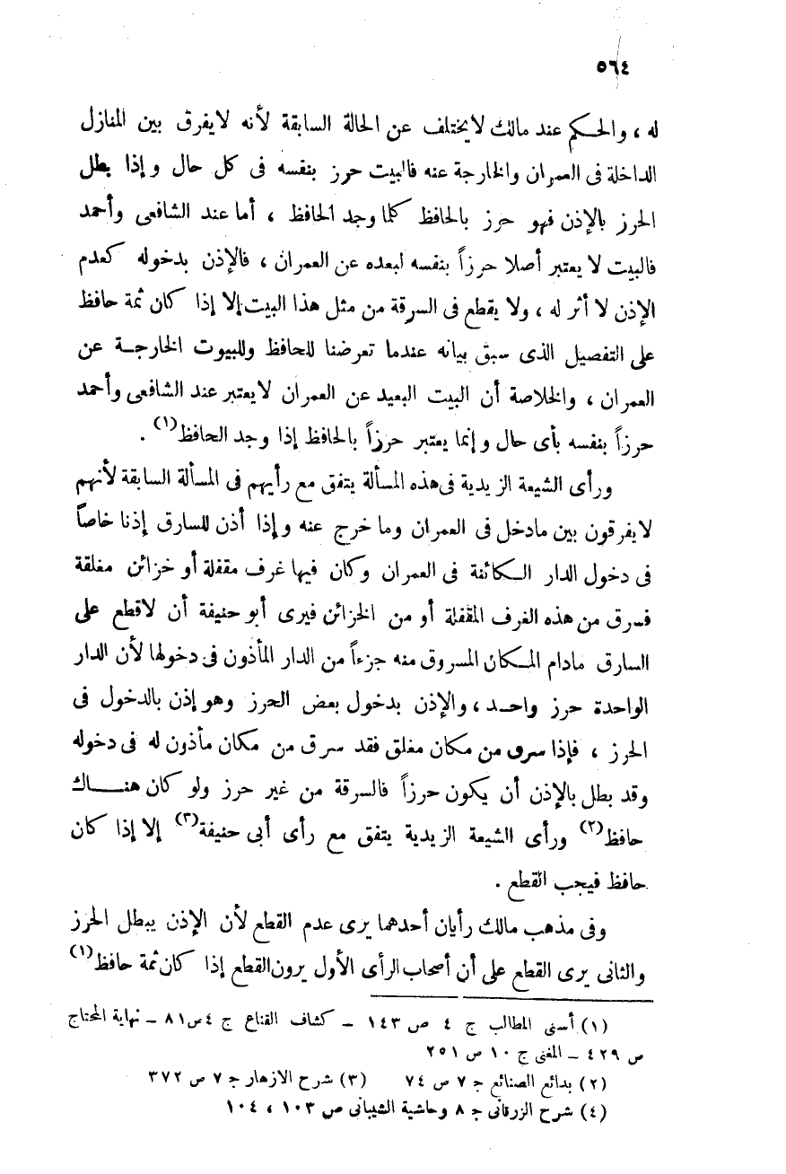 ورأى الشيعة الزيدية فى هذه المسألة يتفق مع رأيهم فى مسألة السابقة لأنهم لا يفرقون بين ما دخل فى العمران وما خرج عنه, وإذا أذن للسارق إذناً خاصاً فى دخول الدار الكائنة فى العمران وكان فيها غرف مقفلة أو خزائن مغلقة فسرق من هذه الغرف المقفلة أو من الخزائن, فيرى أبو حنيفة أن لا قطع على السارق ما دام المكان المسروق منه جزءاً من الدار المأذون فى دخولها لأن الدار الواحدة حرز واحد, والإذن بدخول بعض الحرز هو إذن بالدخول فى الحرز, فإذا سرق من مكان مغلق فقد سرق من مكان مأذون له فى دخوله وقد بطل بالإذن أن يكون حرزاً فالسرقة من غير حرز ولو كان هناك حافظ (¬2) , ورأى الشيعة الزيدية يتفق مع رأى أبى حنيفة (¬3) إلا إذا كان حافظ فيجب القطع.
