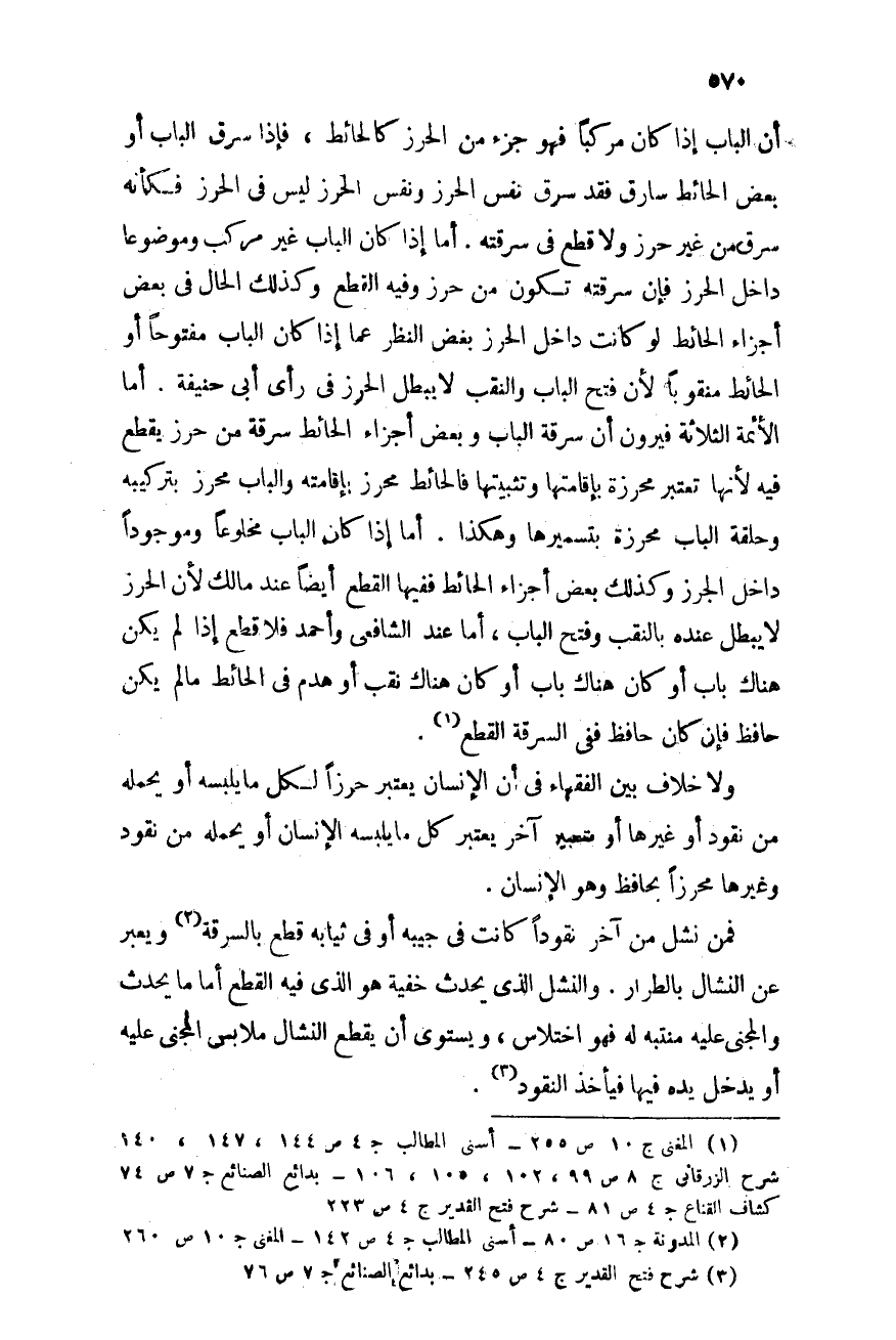 أن الباب إذا كان مركباً فهو جزء من الحرز كالحائط, فإذا سرق الباب أو بعض الحائط سارق فقد سرق نفس الحرز ونفس الحرز ليس فى الحرز فكأنه سرق من غير حرز ولا قطع فى سرقته. أما إذا كان الباب غير مركب وموضوعاً داخل الحرز فإن سرقته تكون من حرز وفيه القطع, وكذلك الحال فى بعض أجزاء الحائط لو كانت داخل الحرز بغض النظر عما إذا كان الباب مفتوحاً أو الحائط منقوباً لأن فتح الباب والنقب لا يبطل الحرز فى رأى أبى حنيفة. أما الأئمة الثلاثة فيرون أن سرقة الباب وبعض أجزاء الحائط سرقة من حرز يقطع فيه لأنها تعتبر محرزة بإقامتها وتثبيتها, فالحائط محرز بإقامته والباب محرز بتركيبه وحلقة الباب محرزة بتسميرها وهكذا. أما إذا كان الباب مخلوعاً وموجوداً داخل الحرز وكذلك بعض أجزاء الحائط ففيها القطع أيضاً عند مالك لأن الحرز لا يبطل عنده بالنقب وفتح الباب, أما عند الشافعى وأحمد فلا قطع إذا لم يكن هناك باب أو كان هناك باب وكان هناك نقب أو هدم فى الحائط ما لم يكن حافظ فإن كان حافظ ففى السرقة القطع (¬1) .