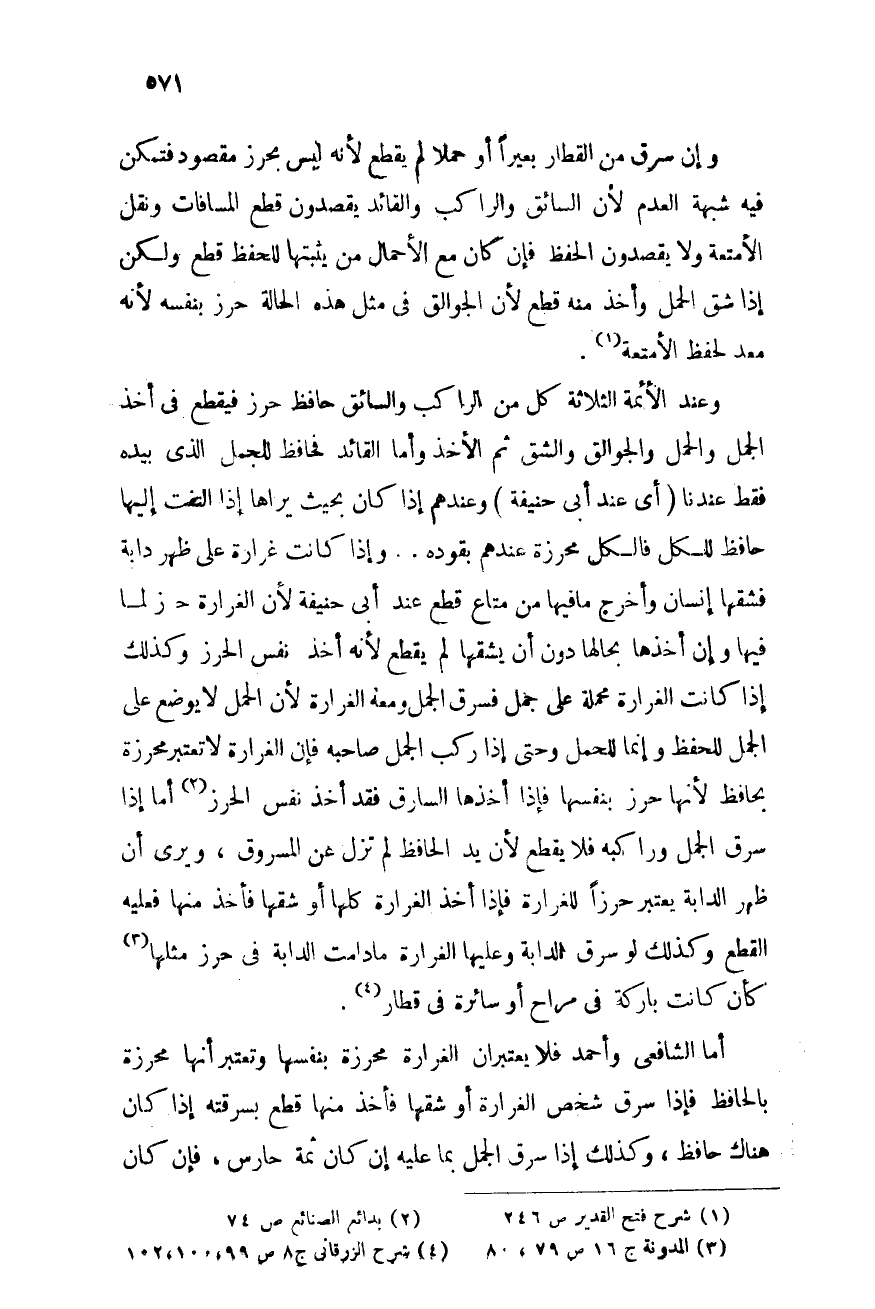 وعند الأئمة الثلاثة كل من الراكب والسائق حافظ حرز فيقطع فى أخذ الجمل والحمل والجوالق والشق ثم الأخذ، وأما القائد فحافظ للجمل الذى بيده فقط عندنا (أى عند أبى حنيفة) ، وعندهم إذا كان بحيث يراها إذا التفت إليها حافظ للكل فالكل محرزة عندهم بقوده ... وإذا كانت غرارة على ظهر دابة فشقها إنسان وأخرج ما فيها من متاع قطع عند أبى حنيفة لأن الغرارة حرز لما فيها، وإن أخذها بحالها دون أن يشقها لم يقطع لأنه أخذ نفس الحرز، وكذلك إذا كانت الغرارة محملة على جمل فسرق الجمل ومعه الغرارة لأن الحمل لا يوضع على الجمل للحفظ وإنما للحمل وحتى إذا ركب الجمل صاحبه فإن الغرارة لا تعتبر محرزة بحافظ لأنها حرز بنفسها فإذا أخذها السارق فقد أخذ نفس الحرز (¬2) ، أما إذا سرق الجمل وراكبه فلا يقطع لأن يد الحافظ لم تزل عن المسروق، ويرى أن ظهر الدابة يعتبر حرزاً للغرارة فإذا أخذ الغرارة كلها أو شقها فأخذ منها فعليه القطع، وكذلك لو سرق الدابة وعليها الغرارة ما دامت الدابة فى حرز مثلها (¬3) ، كأن كانت باركة فى مراح أو سائرة فى قطار (¬4) .