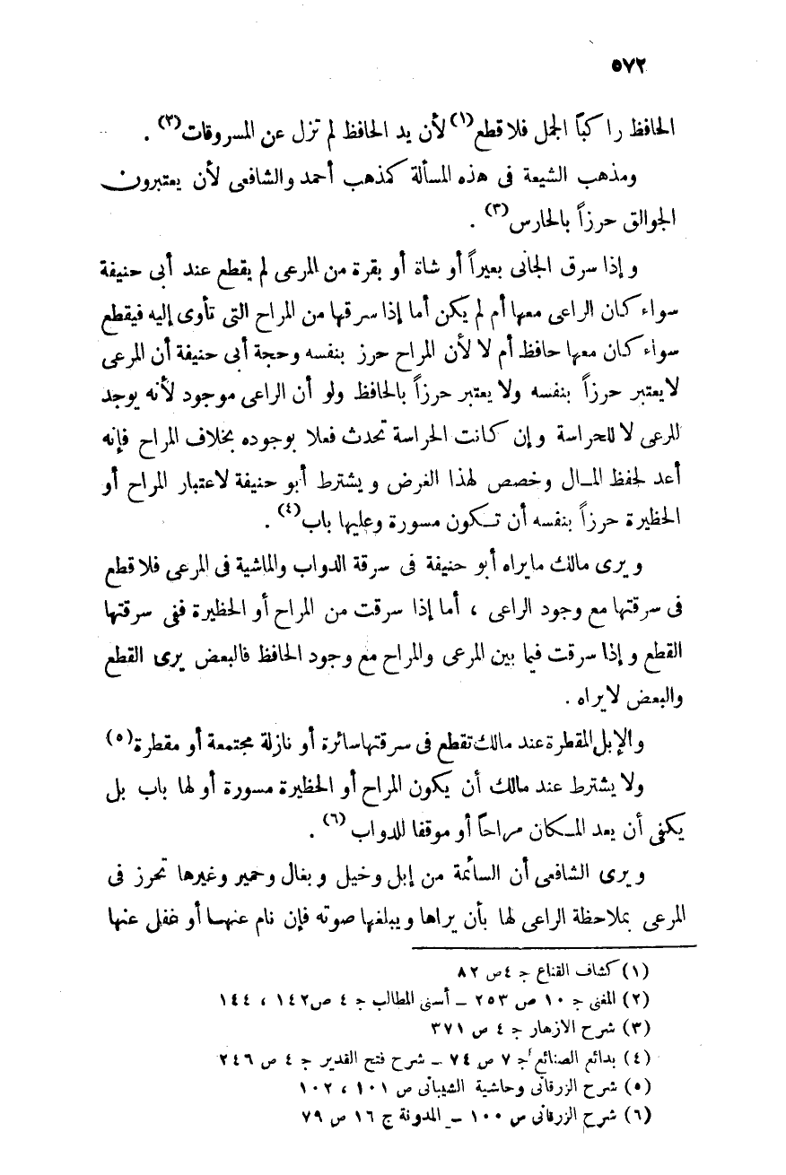 ويرى الشافعى أن السائمة من إبل وخيل وبغال وحمير وغيرها تحرز فى المرعى بملاحظة الراعى لها بأن يراها ويبلغها صوته فإن نام عنها أو غفل عنها