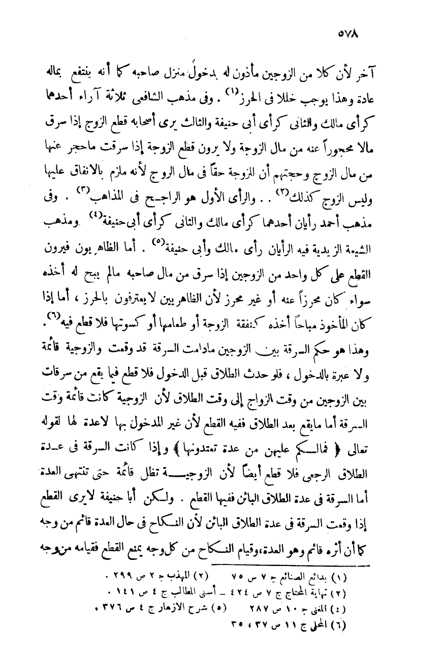 آخر؛ لأن كلاً من الزوجين مأذون له بدخول منزل صاحبه كما أنه ينتفع بماله عادة وهذا يوجب خللاً فى الحرز (¬1) . وفى مذهب الشافعى ثلاثة آراء, أحدها كرأى مالك, والثانى كرأى أبى حنيفة, والثالث يرى أصحابه قطع الزوج إذا سرق مالاً محجورًا عنه من مال الزوجة ولا يرى قطع الزوجة إذا سرقت ما حجر عنها من مال الزوج, وحجتهم أن للزوجة حقًا فى مال الزوج لأنه ملزم بالإنفاق عليها وليس الزوج كذلك (¬2) . والرأى الأول هو الراحج فى المذهب (¬3) . وفى مذهب أحمد رأيان أحدهما كرأى مالك, والثانى كرأى أبى حنيفة (¬4) . ومذهب الشيعة الزيدية فيه الرأيان: رأى مالك وأبى حنيفة (¬5) . أما الظاهريون فيرون القطع على كل واحد من الزوجين إذا سرق من مال صاحبه ما لم يبح له أخذه سواء كان محرزًا عنه أو غير محرز؛ لأن الظاهريين لا يعترفون بالحرز, أما إذا كان المأخوذ مباحًا أخذه كنفقة الزوجة أو طعامها أو كسوتها فلا قطع فيه (¬6) .