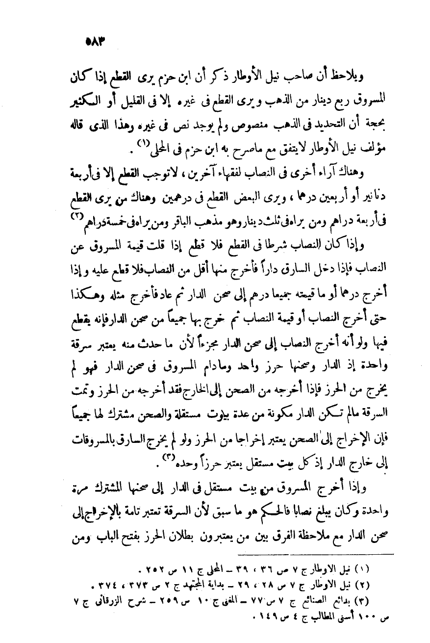 ويلاحظ أن صاحب نيل الأوطار ذكر أن ابن حزم يرى القطع إذا كان المسروق ربع دينار من الذهب ويرى القطع فى غيره إلا فى القليل أو الكثير بحجة أن التحديد فى الذهب منصوص ولم يوجد نص فى غيره, وهذا الذى قاله مؤلف نيل الأوطار لا يتفق مع ما صرح به ابن حزم فى المحلى (¬1) .