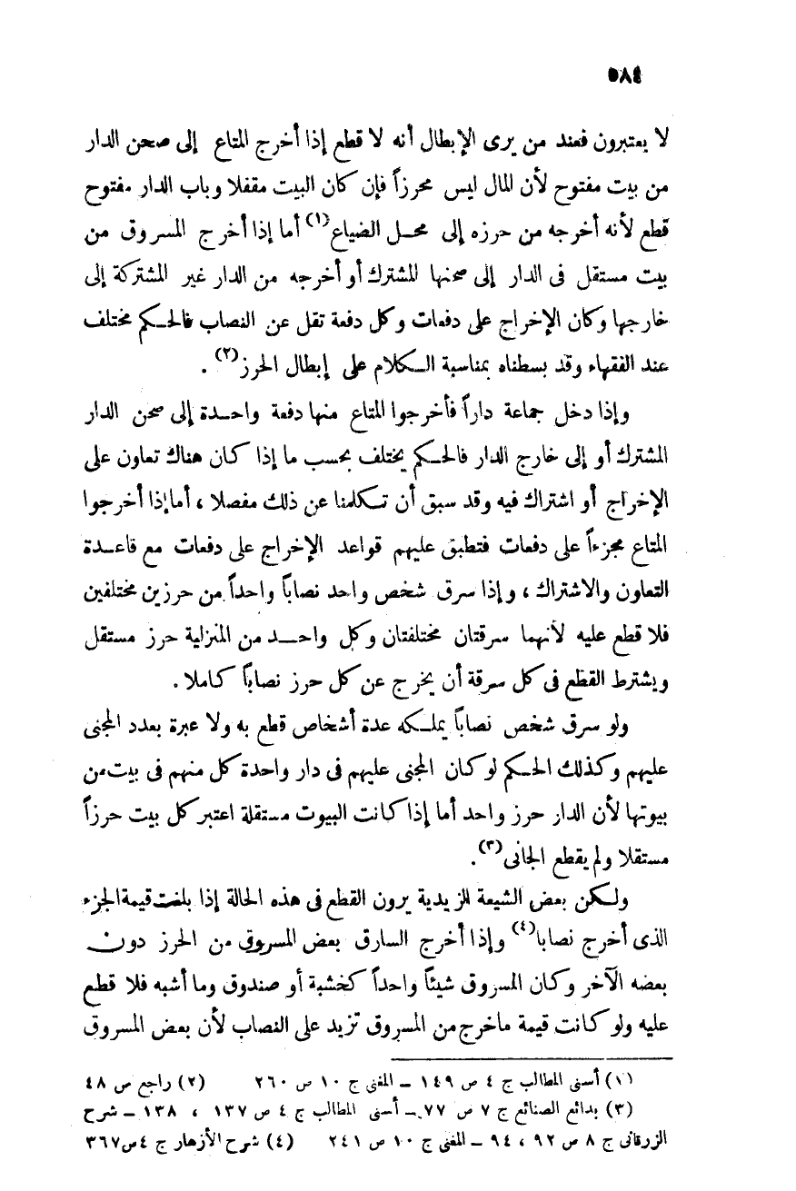 ولو سرق شخص نصابًا يملكه عده أشخاص قطع به ولا عبرة بعدد المجنى عليهم, وكذلك الحكم لو كان المجنى عليهم فى دار واحدة كل منهم فى بيت من بيوتها لأن الدار حرز واحد, أما إذا كانت البيوت مستقلة اعتبر كل بيت حرزًا مستقلاً ولم يقطع الجاني (¬3) .