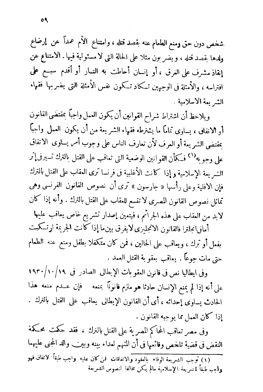 ويلاحظ أن اشتراط شراح القوانين أن يكون العمل واجبًا بمقتضى القانون أو الاتفاق يساوى تمامًا ما يشترطه فقهاء الشريعة من أن يكون العمل واجبًا بمقتضى الشريعة أو العرف؛ لأن تعارف الناس على وجوب أمر يساوى الاتفاق على وجوبه (¬1) فكأن القوانين الوضيعة التى تعاقب على القتل بالترك تسير فى إثر الشريعة الإسلامية وإذا كانت الأغلبية فى فرنسا ترى العقاب على القتل بالترك فإن الأقلية وعلى رأسها "جارسون" ترى أن نصوص القانون الفرنسى - وهى تماثل نصوص القانون المصرى - لا تتسع للعقاب على القتل بالترك، وأنه إذا كان لابد من العقاب على هذه الجرائم فيتعين إصدار تشريع خاص يعاقب عليها.