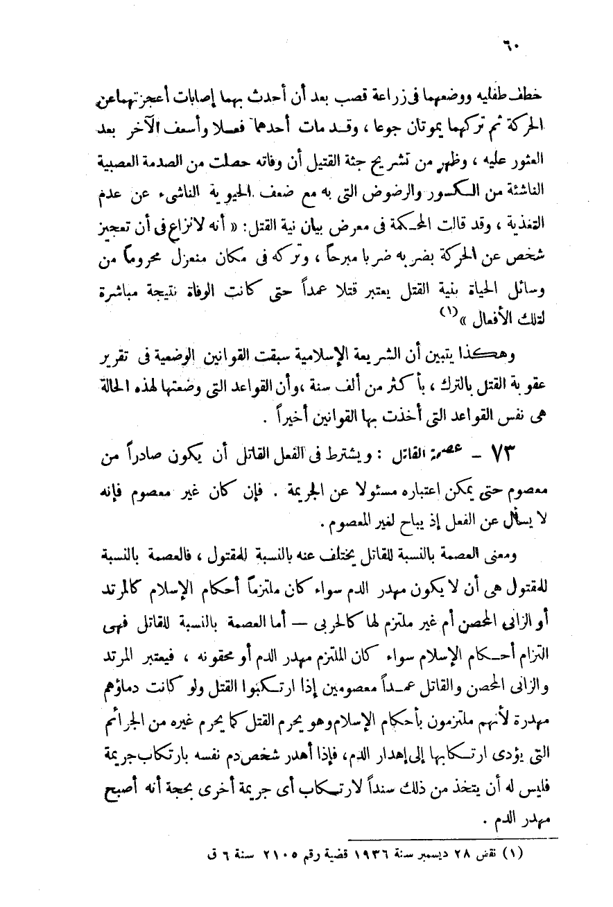 73 - عصمة القاتل: ويشترط فى الفعل القاتل أن يكون صادرًا من معصوم حتى يمكن اعتباره مسئولاً عن الجريمة. فإن كان غير معصوم فإنه لا يسأل عن الفعل إذ يباح لغير المعصوم.
