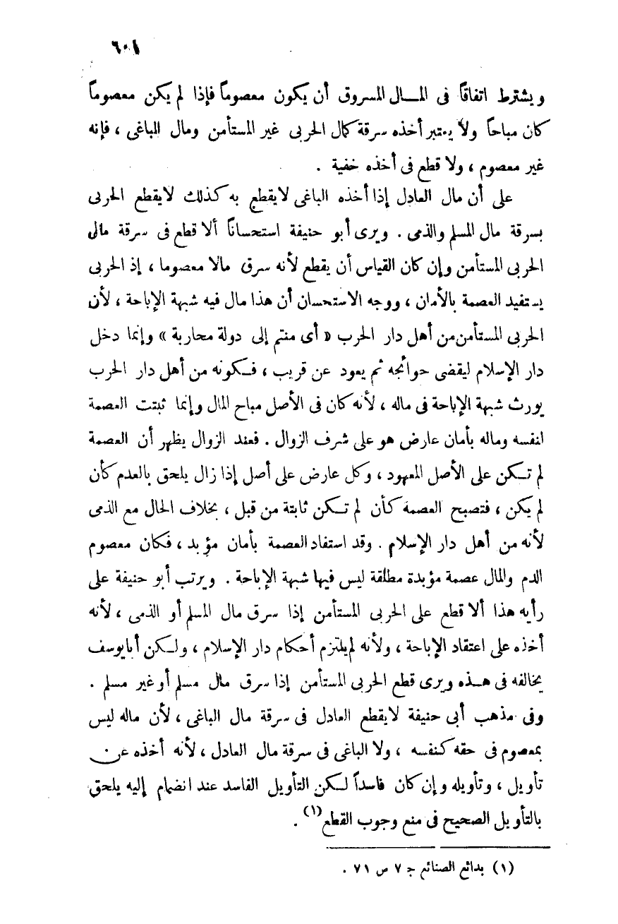 على أن مال العادل إذا أخذه الباغى لا يقطع به, كذلك لا يقطع الحربى بسرقة مال المسلم والذمى. ويرى أبو حنيفة استحسانًا ألا قطع فى سرقة مال الحربى المستأمن وإن كان القياس أن يقطع لأنه سرق مالاً معصومًا, إذ الحربى يستفيد العصمة بالأمان, ووجه الاستحسان أن هذا مال فيه شبهة الإباحة, لأن الحربى المستأمن من أهل دار الحرب "أى مُنتمٍ إلى دولة محاربة", وإنما دخل دار الإسلام ليقضى حوائجه ثم يعود من قريب, فكونه من أهل دار الحرب يورث شبهة الإباحة فى ماله, لأنه كان فى الأصل مباح المال وإنما ثبتت العصمة لنفسه وماله بأمان عارض هو على شرف الزوال, فعند الزوال يظهر أن العصمة لم تكن على الأصل المعهود, وكل عارض على أصل إذا زال يلحق بالعدم كأن لم يكن, فتصبح العصمة كأن لم تكن ثابتة من قبل, بخلاف الحال مع الذمى لأنه من أهل دار الإسلام, وقد استفاد العصمة بأمان مؤبد, فكان معصوم المال عصمة مؤبدة مطلقة ليس فيها شبهة الإباحة, ويرتب أبو حنيفة على رأيه هذا ألا قطع على الحربى المستأمن إذا سرق مال المسلم أو الذمي, لأنه أخذه على اعتقاد الإباحة, ولأنه لم يلتزم أحكام دار الإسلام, ولكن أبا يوسف يخالفه فى هذا ويرى قطع الحربى المستأمن إذا سرق مال مسلم أو غير مسلم. وفى مذهب أبى حنيفة: لا يقطع العادل فى سرقة مال الباغي؛ لأن ماله ليس بمعصوم فى حقه كنفسه, ولا الباغى فى سرقة مال العادل, لأنه أخذه عن تأويل؛ وتأويله وإن كان فاسدًا لكن التأويل الفاسد عند انضمام إليه يلحق بالتأويل الصحيح فى منع وجوب القطع (¬1) .