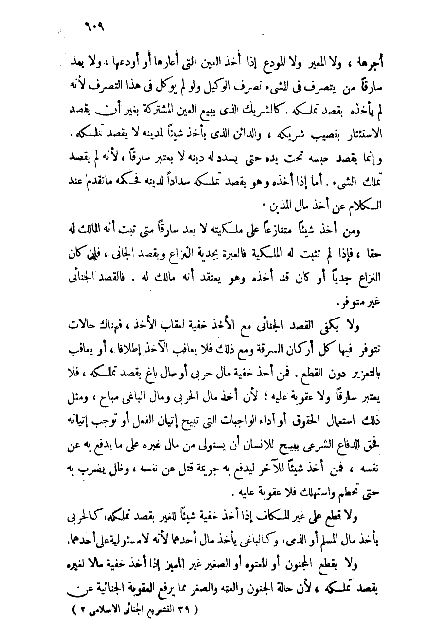 أجرها, ولا المعير ولا المودع إذا أخذ العين التى أعارها أو أودعها, ولا يعد سارقًا من يتصرف فى الشيء تصرف الوكيل ولو لم يوكل فى هذا التصرف لأنه لم يأخذه بقصد تملكه, كالشريك الذى يبيع العين المشتركة بغير أن يقصد الاستئثار بنصيب شريكه, والدائن الذى يأخذ شيئًا لمدينه لا يقصد تملكه وإنما يقصد حبسه تحت يده حتى يسدد له دينه لا يعتبر سارقًا, لأنه لم يقصد تملك الشيء. أما إذا أخذه وهو يقصد تملكه سدادًا لدَيْنه فحكمه ما تقدم عند الكلام عن أخذ مال المدين.