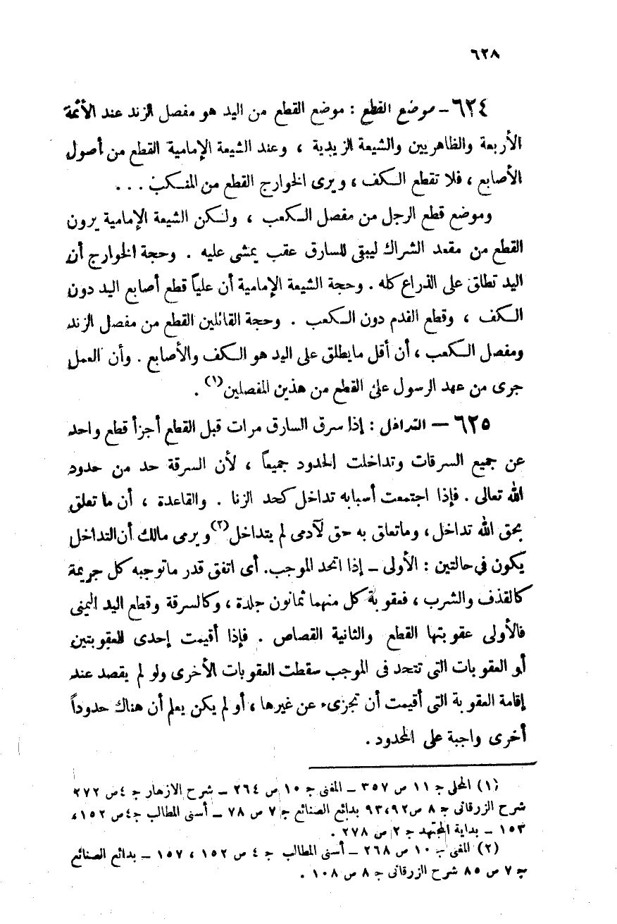 624- موضع القطع: موضع القطع من اليد هو مفصل الزند عند الأئمة الأربعة والظاهريين والشيعة الزيدية, وعند الشيعة الإمامية القطع من أصول الأصابع, فلا تقطع الكف, ويرى الخوارج القطع من المنكب.