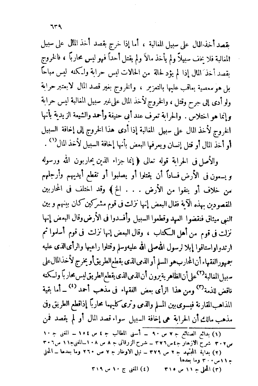 بقصد أخذ المال على سبيل المغالبة, أما إذا خرج بقصد أخذ المال على سبيل المغالبة فلم يخف سبيلاً ولم يأخذ مالاً ولم يقتل أحدًا فهو ليس محاربًا, فالخروج بقصد أخذ المال إذا لم يؤد لحالة من الحالات ليس حرابة ولكنه ليس مباحًا بل هو معصية يعاقب عليها بالتعزير, والخروج بغير قصد المال لا يعتبر حرابة ولو أدى إلى جرح وقتل, والخروج لأخذ المال على غير سبيل المغالبة ليس حرابة وإنما هو اختلاس. والحرابة تعرف عند أبى حنيفة وأحمد والشيعة الزيدية بأنها الخروج لأخذ المال على سبيل المغالبة إذا أدى هذا الخروج إلى إخافة السبيل أو أخذ المال أو قتل إنسان, ويعرفها البعض بأنها إخافة السبيل لأخذ المال (¬1) .