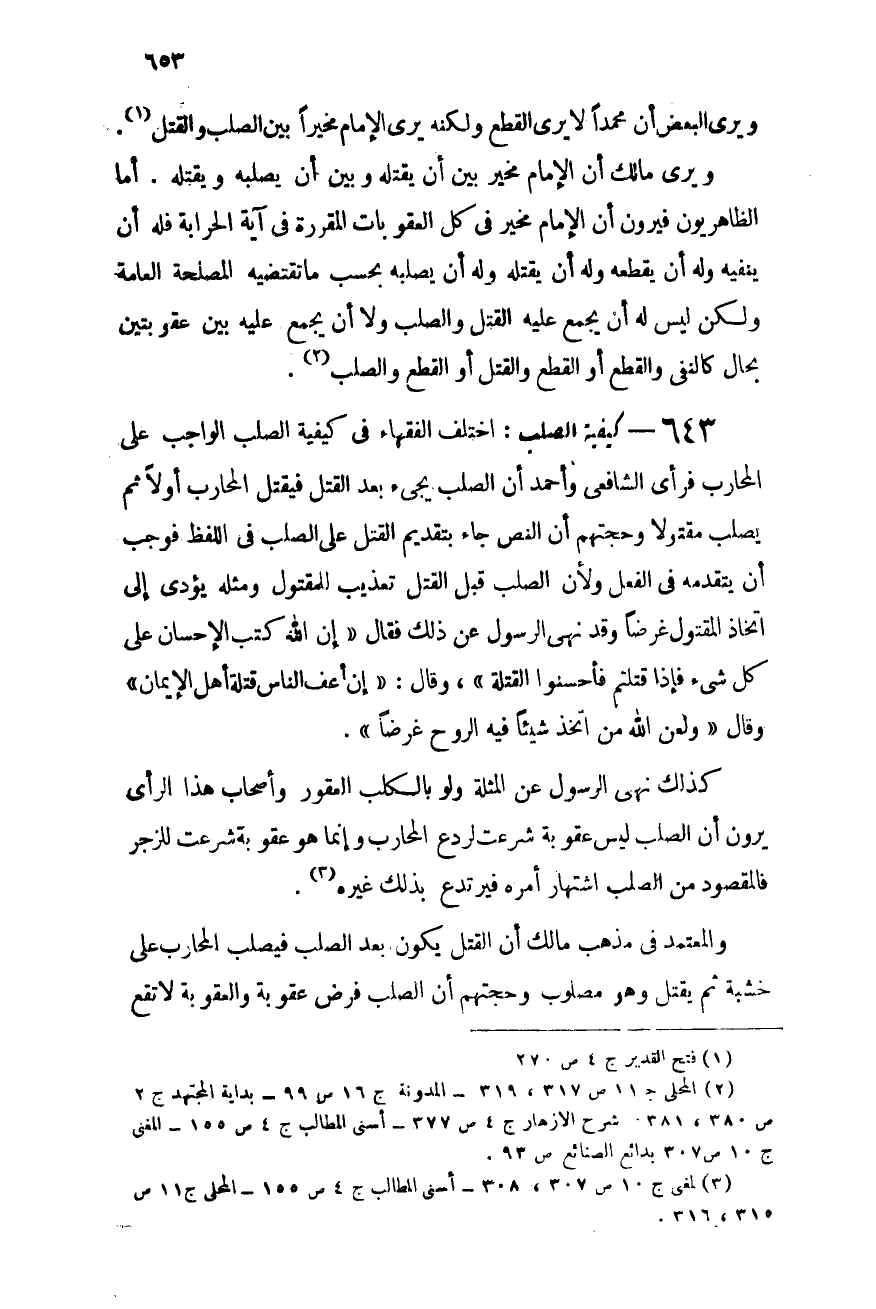 ويرى مالك أن الإمام مخير بين أن يقتله وبين أن يصلبه ويقتله, أما الظاهريون فيرون أن الإمام مخير فى كل العقوبات المقررة فى آية الحرابة فله أن ينفيه وله أن يقطعه وله أن يقتله وله أن يصلبه بحسب ما تقتضيه المصلحة العامة, ولكن ليس له أن يجمع عليه القتل والصلب ولا أن يجمع عليه بين عقوبتين بحال كالنفى والقطع أو القطع والقتل أو القطع والصلب (¬2) .