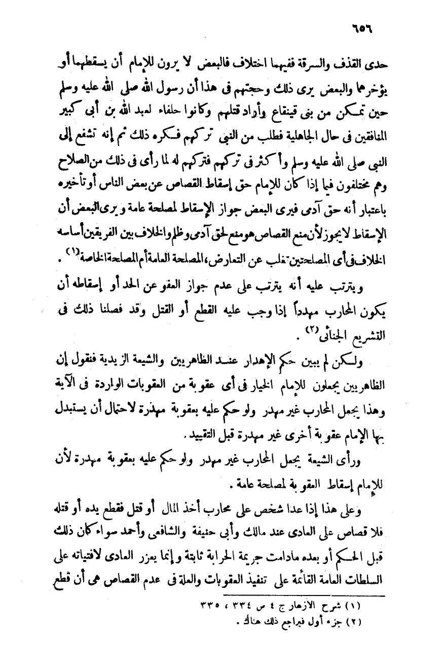 ويترتب عليه أنه يترتب على عدم جواز العفو عن الحد أو إسقاطه أن يكون المحارب مهددًا إذا وجب عليه القطع أو القتل, وقد فصلنا ذلك فى التشريع الجنائي (¬2) , ولكن لم نبين حكم الإهدار عند الظاهريين والشيعة الزيدية, فنقول: إن الظاهريين يجعلون للإمام الخيار فى أى عقوبة من العقوبات الواردة فى الآية, وهذا يجعل المحارب غير مهدر ولو حكم عليه بعقوبة مهدرة لاحتمال أن يستبدل بها الإمام عقوبة أخرى غير مهدرة قبل التقييد.