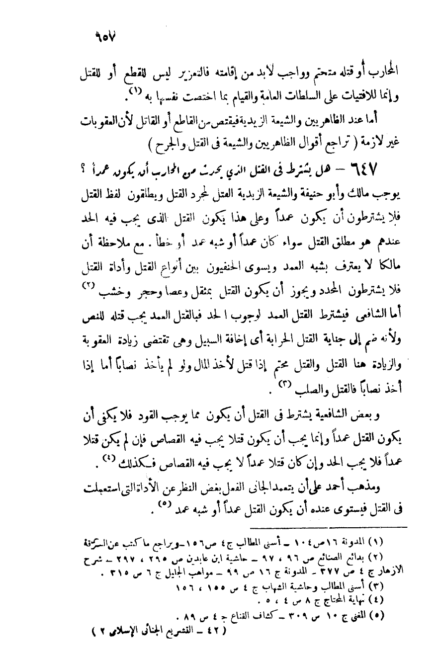 647- هل يشترط فى القتل الذى يحدث من المحارب أن يكون عمدًا؟: يوجب مالك وأبو حنيفة والشيعة الزيدية القتل لمجرد القتل, ويطلقون لفظ القتل فلا يشترطون أن يكون عمدًا, وعلى هذا يكون القتل الذى يجب فيه الحد عندهم هو مطلق القتل سواء كان عمدًا أو شبه عمد أو خطأ. مع ملاحظة أن مالكًا لا يعترف بشبه العمد, ويسوى الحنفيون بين أنواع القتل وأداة القتل فلا يشترطون المحدد ويجوز أن يكون القتل بمثقل وعصًا وحجر وخشب (¬2) , أما الشافعى فيشترط القتل العمد لوجوب الحد, فبالقتل العمد يجب قتله للنص ولأنه ضم إلى جناية القتل الحرابة أى إخافة السبيل وهى تقتضى زيادة العقوبة, والزيادة هنا القتل والقتل محتم إذا قتل لأخذ مال ولو لم يأخذ نصابًا, أما إذا أخذ نصابًا فالقتل والصلب (¬3) .