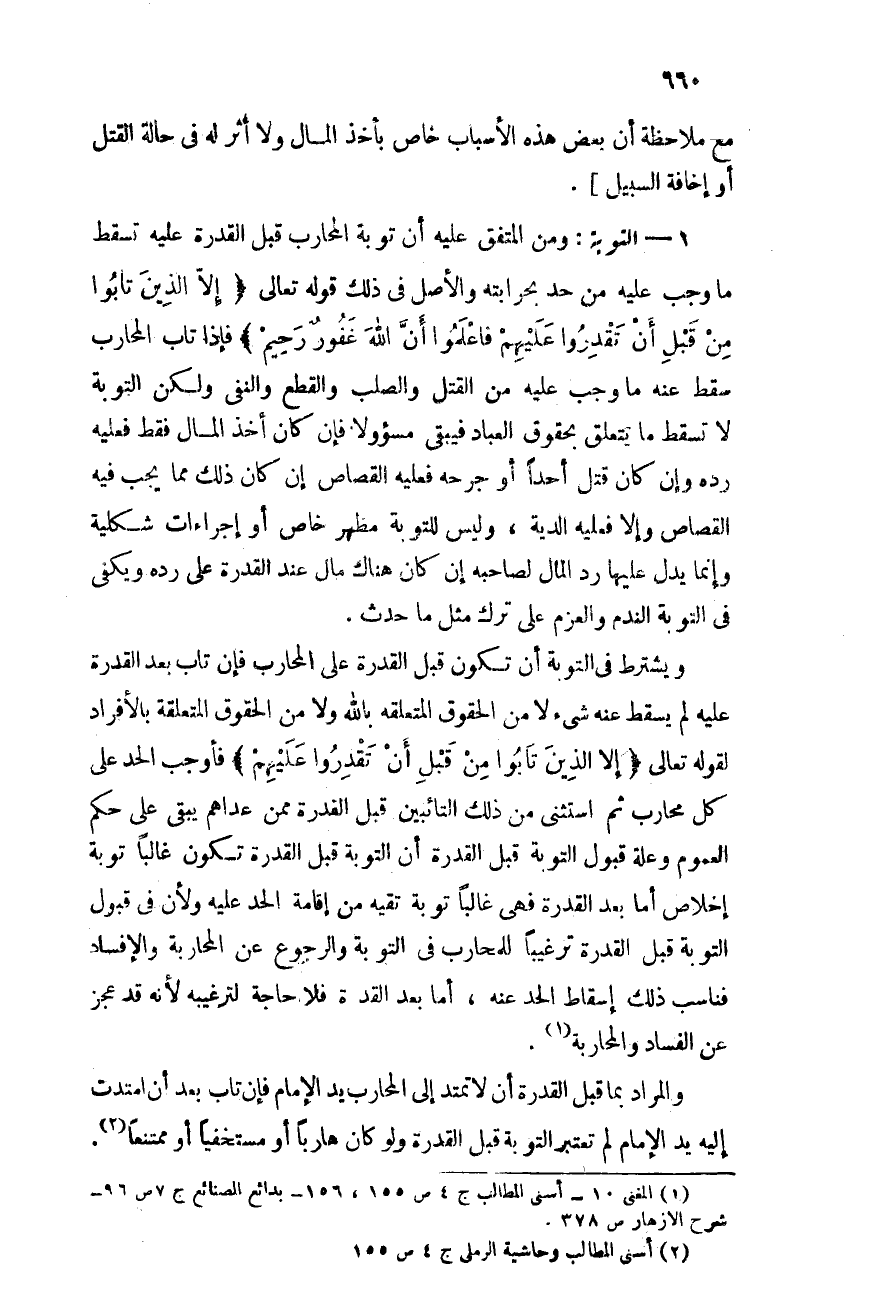 ويشترط فى التوبة أن تكون قبل القدرة على المحارب فإن تاب بعد القدرة عليه لم يسقط عنه شيء لا من الحقوق المتعلقة بالله ولا من الحقوق المتعلقة بالأفراد, لقوله تعالى: {إِلاَّ الَّذِينَ تَابُواْ مِن قَبْلِ أَن تَقْدِرُواْ عَلَيْهِمْ} , فأوجب الحد على كل محارب ثم استثنى من ذلك التائبين قبل القدرة, ومن عداهم يبقى على حكم العموم, وعلة قبول التوبة قبل القدرة أن التوبة قبل القدرة تكون غالبًا توبة إخلاص أما بعد القدرة فهى غالبًا توبة تقيه من إقامة الحد, عليه ولأن فى قبول التوبة قبل القدرة ترغيبًا للمحارب فى التوبة والرجوع عن المحاربة والإفساد فناسب ذلك إسقاط الحد عنه, أما بعد القدرة فلا حاجة لترغيبه لأنه قد عجز عن الفساد والمحاربة (¬1) .