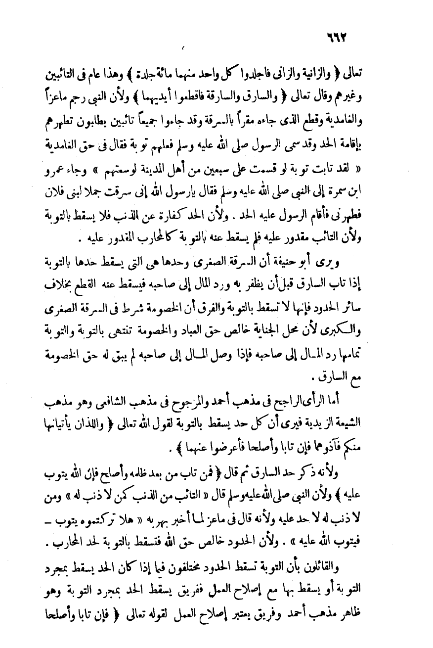 تعالى: {الزَّانِيَةُ وَالزَّانِى فَاجْلِدُوا كُلَّ وَاحِدٍ مِّنْهُمَا مِئَةَ جَلْدَةٍ} [النور: 2] , وهذا عامٌّ فى التائبين وغيرهم, وقال تعالى: {وَالسَّارِقُ وَالسَّارِقَةُ فَاقْطَعُواْ أَيْدِيَهُمَا} [المائدة:38] , ولأن النبى - صلى الله عليه وسلم - رجم ماعزًا والغامدية وقطع الذى جاءه مقرًا بالسرقة وقد جاءوا جميعًا تائبين يطلبون تطهرهم بإقامة الحد, وقد سمى الرسول - صلى الله عليه وسلم - فعلهم توبة فقال فى حق الغامدية: "لقد تابت توبة لو قسمت على سبعين من أهل المدينة لوسعتهم", وجاء عمرو بن سمرة إلى النبى - صلى الله عليه وسلم - فقال: "يا رسول الله إنى سرقت جملاً لبنى فلان فطهرني, فأقام الرسول عليه الحد". ولأن الحد كفارة عن الذنب فلا يسقط بالتوبة, ولأن التائب مقدور عليه فلم يسقط عنه بالتوبة كالمحارب المقدور عليه.