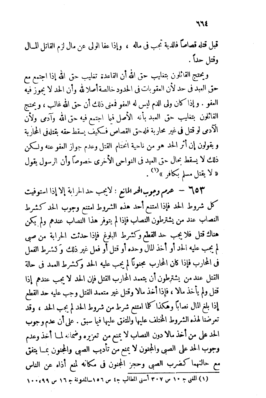 653- عدم وجوب الحد المانع: لا يجب حد الحرابة إلا إذا استوفت كل شروط الحد, فإذا امتنع أحد الشروط امتنع وجوب الحد كشرط النصاب عند من يشترطون النصاب, فإذا لم يتوفر هذا النصاب عندهم ولم يكن هناك قتل فلا يجب حد القطع, وكشرط البلوغ فإذا حدثت الحرابة من صبى لم يجب عليه الحد أو أخذ المال وحده أو قتل أو فعل غير ذلك, وكشرط العقل فى المحارب فإذا كان المحارب مجنونًا لم يجب عليه الحد, وكشرط العمد فى حالة القتل عند من يشترطون أن يتعمد المحارب القتل, فإن الحد لا يجب عندهم إذا قتل ولم يأخذ مالاً, فإذا أخذ مالاً وقتل غير متعمد القتل وجب عليه حد القطع إذا بلغ المال نصبًا, وهكذا كلما امتنع شرط من شروط الحد لم يجب الحد, وقد تعرضنا لهذه الشروط المختلف عليها والمتفق عليها فيما سبق. على أن عدم وجوب الحد على من أخذ مالاً دون النصاب لا يمنع تعزيره وضمانه لما أخذ, وعدم وجوب الحد على الصبى والمجنون لا يمنع من تأديب الصبى والمجنون بما يتفق مع حالتهما كضرب الصبى وحجز المجنون فى مكان لمنع أذاه عن الناس