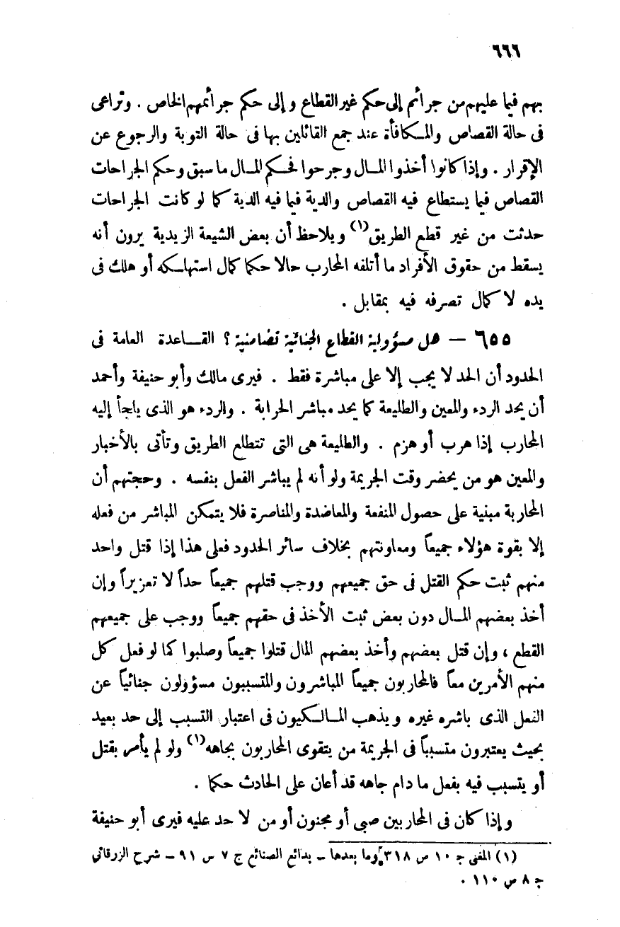 655- هل مسئولية القطاع الجنائية تضامنية؟: القاعدة العامة فى الحدود أن الحد لا يجب إلا على مباشِره فقط. ويرى مالك وأبو حنيفة وأحمد أن يُحَدَّ الرِّدْء والمعين والطليعة كما يحد مباشر الحرابة. والرِّدْء هو الذى يلجأ إليه المحارب إذا هرب أو هزم, والطليعة هى التى تتطلع الطريق وتأتى بالأخبار, والمعين هو من يحضر وقت الجريمة ولو أنه لم يباشر الفعل بنفسه. وحجتهم أن المحاربة مبنية على حصول المنفعة والمعاضدة والمناصرة فلا يتمكن المباشر من فعله إلا بقوة هؤلاء جميعًا ومعاونتهم بخلاف سائر الحدود, فعلى هذا إذا قتل واحد منهم ثبت حكم القتل فى حق جميعهم ووجب قتلهم جميعًا حدًا لا تعزيرًا, وإن أخذ بعضهم المال دون بعض ثبت الأخذ فى حقهم جميعًا ووجب على جميعهم القطع, وإن قتل بعضهم وأخذ بعضهم المال قتلوا جميعًا وصلبوا كما لو فعل كل منهم الأمرين معًا, فالمحاربون جميعًا المباشرون والمتسببون مسئولون جنائيًا عن الفعل الذى باشره غيره. ويذهب المالكيون فى اعتبار التسبب إلى حد بعيد بحيث يعتبرون متسببًا فى الجريمة من يتقوى المحاربون بجاهه ولو لم يأمر بقتل أو يتسبب فيه بفعل ما دام جاهه قد أعان على الحادث حكمًا.