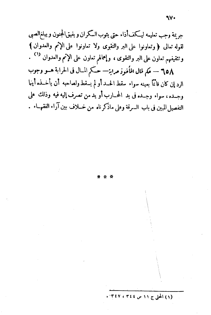 658- حكم المال المأخوذ حرابة: حكم المال فى الحرابة هو وجوب الرد وإن كان قائمًا بعينه سواء سقط الحد أو لم يسقط, ولصاحبه أن يأخذه أينما وجده سواء وجده فى يد المحارب أو يد من تصرف إليه فيه, وذلك على التفصيل المبين فى باب السرقة, وعلى ما ذكرناه من خلاف بين الفقهاء.