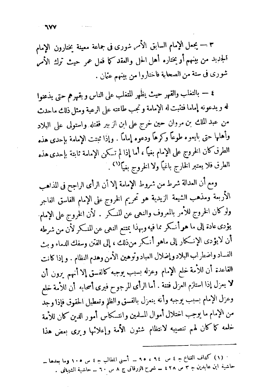 ومع أن العدالة شرط من شروط الإمامة إلا أن الرأى الراجح فى المذاهب الأربعة ومذهب الشيعة الزيدية هو تحريم الخروج على الإمام الفاسق الفاجر ولو كان الخروج للأمر بالمعروف والنهى عن المنكر؛ لأن الخروج على الإمام يؤدى عادة إلى ما هو أنكر مما فيه وبهذا يمتنع النهى عن المنكر لأن من شرطه أن لا يؤدى الإنكار إلى ما هو أنكر من ذلك, إلى الفتن وسفك الدماء وبث الفساد واضطراب البلاد وإضلال العباد وتوهين الأمن وهدم النظام. وإذا كانت القاعدة أن للأمة خلع الإمام وعزلة بسبب يوجبه كالفسق إلا أنهم يرون أن لا يعزل إذا استلزم العزل الفتنة. أما الرأى المرجوح فيرى أصحابه أن للأمة خلع وعزل الإمام بسبب يوجبه وأنه ينعزل بالفسق والظلم وتعطيل الحقوق, فإذا وجد من الإمام ما يوجب اختلال أموال المسلمين وانتكاس أمور الدين كان للأمة خلعه كما كان لهم تنصيبه لانتظام شئون الأمة وإعلائها, ويرى بعض هذا