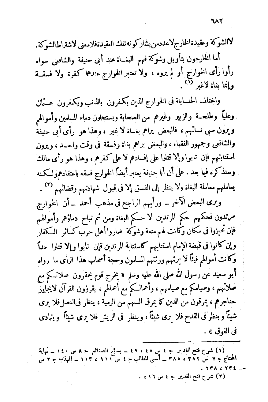 واختلف الحنابلة فى الخوارج الذين يكفِّرون بالذنب ويكفِّرون عثمان وعليًا وطلحة والزبير وغيرهم من الصحابة, ويستحلون دماء المسلمين وأموالهم ويرون سبى نسائهم, والبعض يراهم بغاة لا غير, وهذا هو رأى أبى حنيفة والشافعى وجمهور الفقهاء, والبعض يراهم بغاة وفسقة فى وقت واحد, ويرون استتابتهم فإن تابوا وإلا قتلوا على إفسادهم لا على كفرهم, وهذا هو رأى مالك وسنذكره فيما بعد. على أن أبا حنيفة يعتبر أيضًا الخوارج فسقة باعتقادهم ولكنه يعاملهم معاملة البغاة ولا ينظر إلى الفسق إلا فى قبول شهادتهم وقضائهم (¬2) .