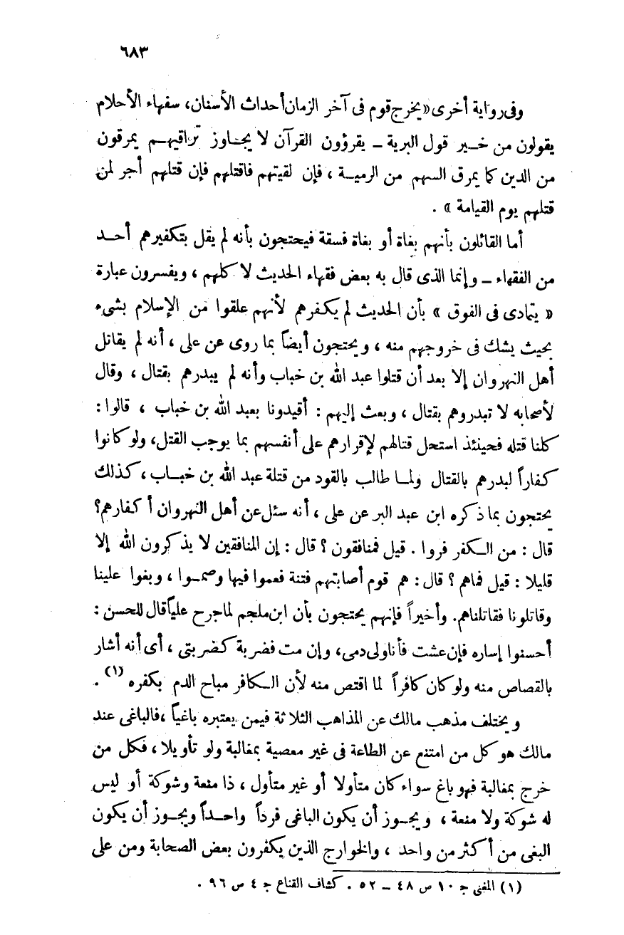 أما القائلون بأنهم بغاة أو بغاة فسقة فيحتجون بأنه لم يقل بتكفيرهم أحمد من الفقهاء, وإنما الذى قال به بعض فقهاء الحديث لا كلهم, ويفسرون عبارة "يتمادى فى الفوق" بأن الحديث لم يكفرهم لأنهم علقوا من الإسلام بشيء بحيث يشك فى خروجهم منه, ويحتجون أيضًا بما روى عن على أنه لم يقاتل أهل النهروان إلا بعد أن قتلوا عبد الله بن خباب وأنه لم يبدرهم بقتال, وقال لأصحابه: لا تبدروهم بقتال, وبعث إليهم: أقيدونا بعبد الله بن خباب. قالوا: كلنا قتله, فحينئذ استحل قتالهم لإقرارهم على أنفسهم بما يوجب القتل, ولو كانوا كفارًا لبدرهم بالقتال ولما طالب بالقَوَد من قتلة عبد الله بن خباب. كذلك يحتجون بما ذكره ابن عبد البر عن على أنه سئل عن أهل النهروان: أكفار هم؟ قال: من الكفر فروا. قيل: فمنافقون؟ قال: إن المنافقين لا يذكرون الله إلا قليلاً. قيل فما هم؟ قال: هم قوم أصابتهم فتنة فعموا فيها وصموا, وبغوا علينا وقاتلونا فقاتلناهم. وأخيرًا فإنهم يحتجون بأن عليًا لما جرحه ابن ملجم قال للحسن: أحسنوا إساره؛ فإن عشتُ فأنا ولى دمي, وإن مت فضربة كضربتي, أى أنه أشار بالقصاص منه ولو كان كافرًا لَمَا اقتص منه لأن الكافر مباح الدم بكفره (¬1) .