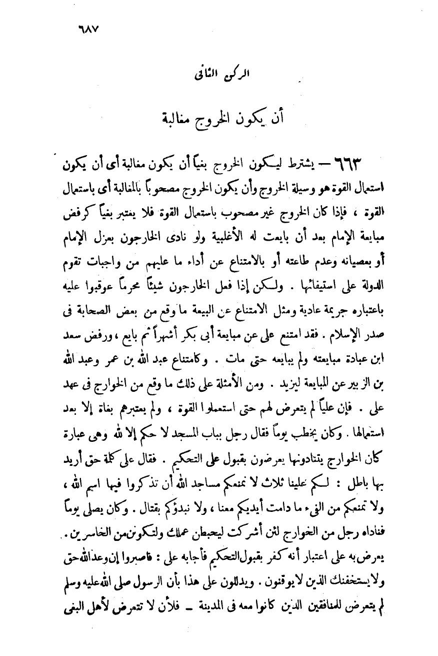 663- يشترط ليكون الخروج بغيًا أن يكون مغالبة أى أن يكون استعمال القوة هو وسيلة الخروج وأن يكون الخروج مصحوبًا بالمغالبة أى باستعمال القوة, فإذا كان الخروج غير مصحوب باستعمال القوة فلا يعتبر بغيًا كرفض مبايعة الإمام بعد أن بايعت له الأغلبية ولو نادى الخارجون بعزل الإمام أو بعصيانه وعدم طاعته أو بالامتناع عن أداء ما عليهم من واجبات تقوم الدولة على استيفائها. ولكن إذا فعل الخارجون شيئًا محرمًا عوقبوا عليه باعتباره جريمة عادية. ومثل الامتناع عن البيعة ما وقع من بعض الصحابة فى صدر الإسلام, فقد امتنع على عن مبايعة أبى بكر أشهر ثم بايع, ورفض سعد بن عبادة مبايعته ولم يبايعه حتى مات. وكامتناع عبد الله بن عمر وعبد الله بن الزبير عن المبايعة ليزيد. ومن الأمثلة على ذلك ما وقع من الخوارج فى عهد عليّ, فإن عليًا لم يتعرض لهم حتى استعملوا القوة, ولم يعتبرهم بغاة إلا بعد استعمالها. وكان يخطب يومًا فقال رجل بباب المسجد: لا حكم إلا لله, وهى عبارة كان الخوارج يتنادونها يعرِّضون بقبول على التحكيم. فقال على: كلمة حق أريد بها باطل, لكم علينا ثلاث: لا نمنعكم مساجد الله أن تذكروا فيها اسم الله, ولا نمنعكم من الفيء ما دامت أيديكم معنا, ولا نبدؤكم بقتال. وكان يصلى يومًا فناداه رجل من الخوارج: لئن أشركت ليحبطن عملك ولتكونن من الخاسرين؛ يعرِّض به على اعتبار أنه كفر بقبول التحكيم, فأجابه على: فاصبروا إن وعد الله حق ولا يستخفنك الذين لا يوقنون. ويدللون على هذا بأن الرسول - صلى الله عليه وسلم - لم يتعرض للمنافقين الذين كانوا معه فى المدينة فلأن لا تتعرض لأهل البغى