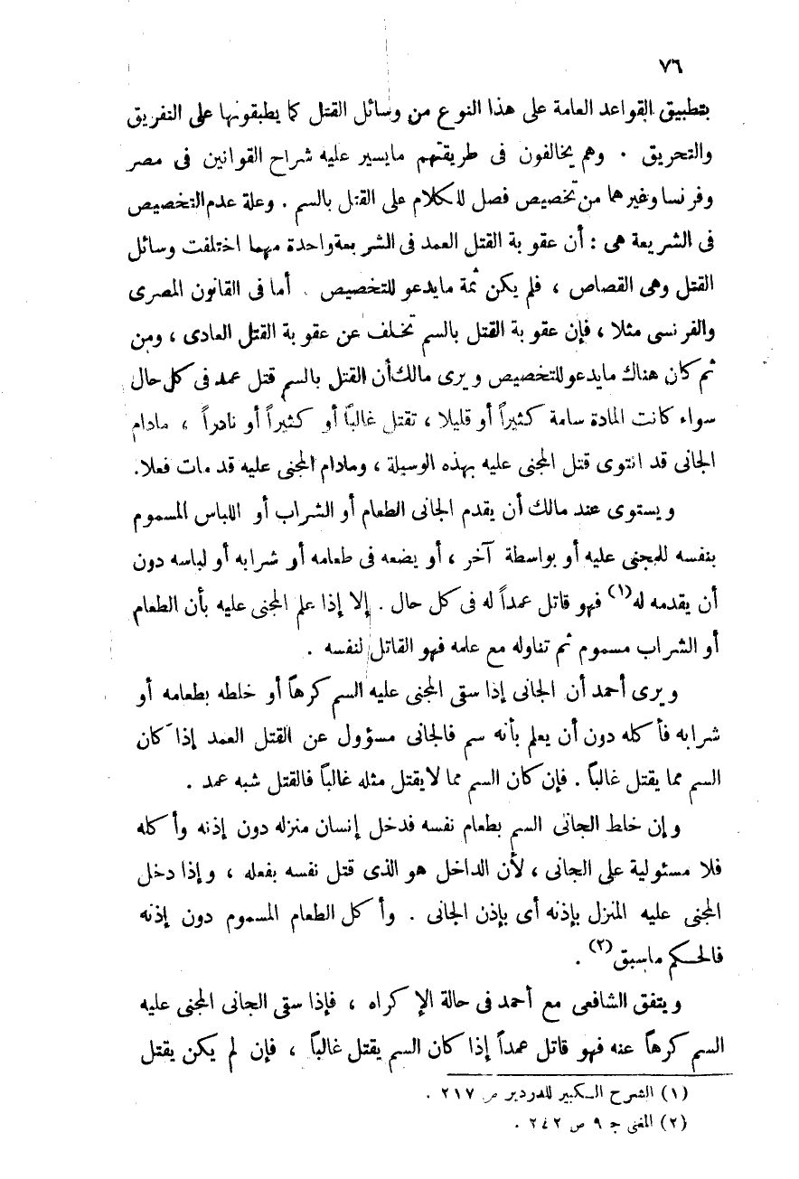 بتطبيق القواعد العامة على هذا النوع من وسائل القتل كما يطبقونها على التغريق والتحريق، وهم يخالفون فى طريقتهم ما يسير عليه شراح القوانين فى مصر وفرنسا وغيرهما من تخصيص فصل للكلام على القتل بالسم. وعلة عدم التخصيص فى الشريعة هى أن عقوبة القتل العمد فى الشريعة واحدة مهما اختلفت وسائل القتل؛ وهى القصاص، فلم يكن ثمة ما يدعو للتخصيص.