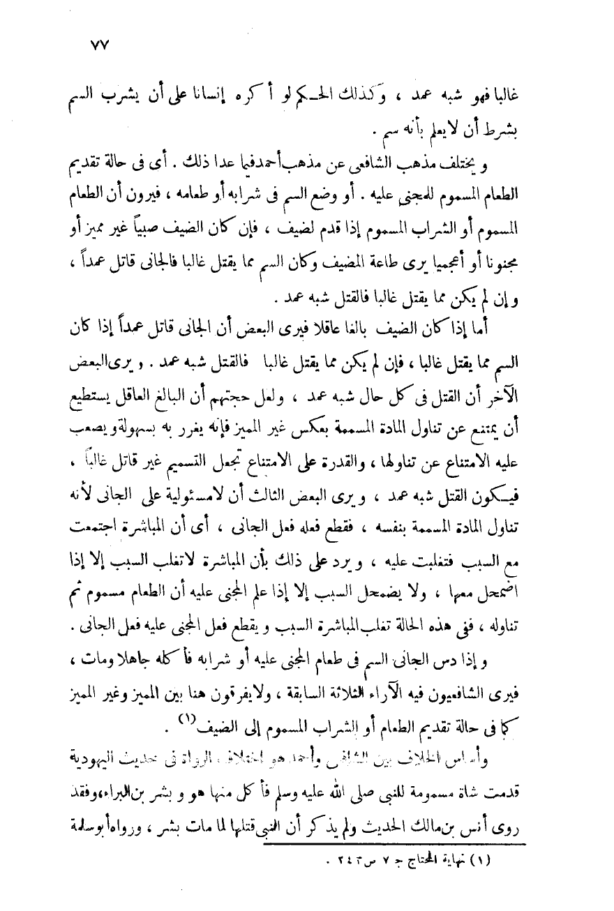 ويختلف مذهب الشافعى عن مذهب أحمد فيما عدا ذلك، أى فى حالة تقديم الطعام المسموم للمجنى عليه أو وضع السم فى شرابه أو طعامه فيرون أن الطعام المسموم أو الشراب المسموم إذا قدم لضيف فإن كان الضيف صبيًا غير مميز أو مجنونًا أو أعجميًا يرى طاعة المضيف وكان السم مما يقتل غالبًا فالجانى قاتل عمدًا وإن لم يكن مما يقتل غالبًا فالقتل شبه عمد.