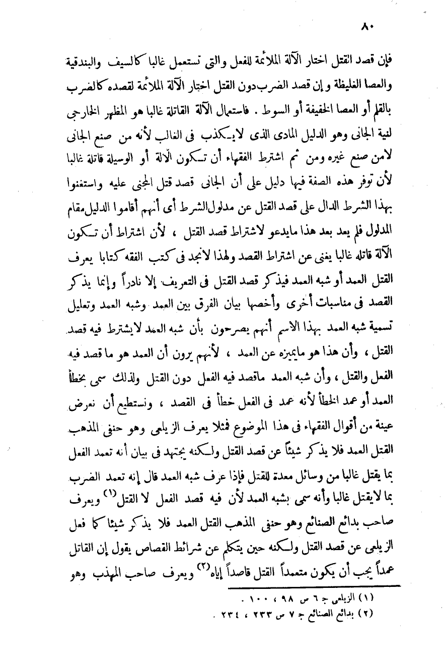 فاستعمال الآلة القاتلة غالبًا هو المظهر الخارجى لنية الجانى، وهو الدليل المادى الذى لا يكذب فى الغالب، لأنه من صنع الجانى لا من صنع غيره، ومن ثم اشترط الفقهاء أن تكون الآلة أو الوسيلة قاتلة غالبًا لأن توفر هذه الصفة فيها دليل على أن الجانى قصد قتل المجنى عليه واستغنوا بهذا الشرط الدال على قصد القتل عن مدلول الشرط أى أنهم أقاموا الدليل مقام المدلول فلم يعد بعد هذا ما يدعو لاشتراط قصد القتل؛ لأن اشتراط أن تكون الآلة قاتلة غالبًا يغنى عن اشتراط القصد، ولهذا لا نجد فى كتب الفقه كتابًا يعرِّف القتل العمد أو شبه العمد فيذكر قصد القتل فى التعريف إلا نادرًا، وإنما يذكر القصد فى مناسبات أخرى، وأخصها بيان الفرق بين العمد وشبه العمد، وتعليل تسمية شبه العمد بهذا الاسم أنهم يصرحون بأن شبه العمد لا يشترط فيه قصد القتل، وأن هذا هو ما يميزه عن العمد، لأنهم يرون أن العمد هو ما قصد فيه الفعل والقتل، وأن شبه العمد ما قصد فيه الفعل دون القتل، ولذلك سمى الخطأ العمد أو عمد الخطأ؛ لأنه عمد فى الفعل خطأ فى القصد.