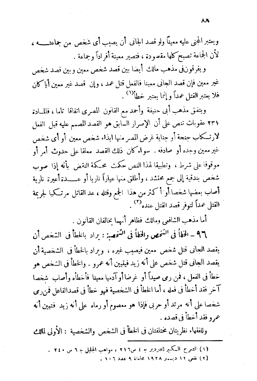 96 - الخطأ فى الشخص والخطأ فى الشخصية: يراد بالخطأ فى الشخص أن يقصد الجانى قتل شخص معين فيصيب غيره، ويراد بالخطأ فى الشخصية أن يقصد الجانى قتل شخص على أنه زيد فيتبين أنه عمرو، والخطأ فى الشخص هو خطأ فى الفعل، فمن رمى صيدًا أو غرضًا أو آدميًا معينًا فأخطأه وأصاب شخصًا آخر فقد أخطأ فى فعله، أما الخطأ فى الشخصية فهو خطأ فى قصد الفاعل، فمن رمى شخصًا على أنه مرتد أو حربى فإذا هو معصوم أو رماه على أنه زيد فتبين أنه عمرو فقد أخطأ فى قصده.