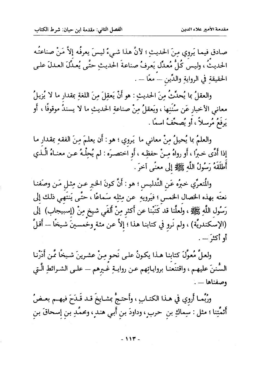 والمتعري خبره عن التدليس هو أن كون الخبر عن مثل مَن وصفنا نعته بهذه الخصال الخمس فيرويه عن مثله سماعاً حتى ينتهي ذلك إلى رسول الله صلى الله عليه وسلم ولعلنا قد كتبنا عن أكثر من ألفي شيخ من (إسبيجاب) إلى (الإسكندرية) ولم نَروِ في كتابنا هذا إلا عن مئة وخمسين شيخاً ـ أقلَّ أو أكثر ـ.